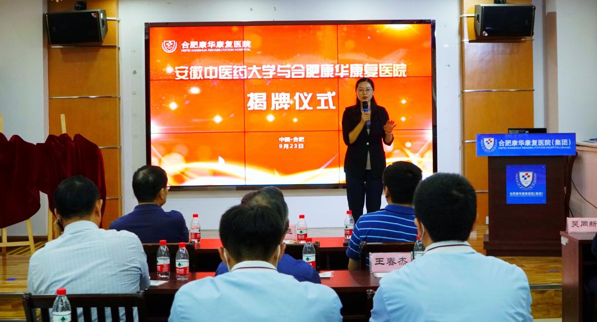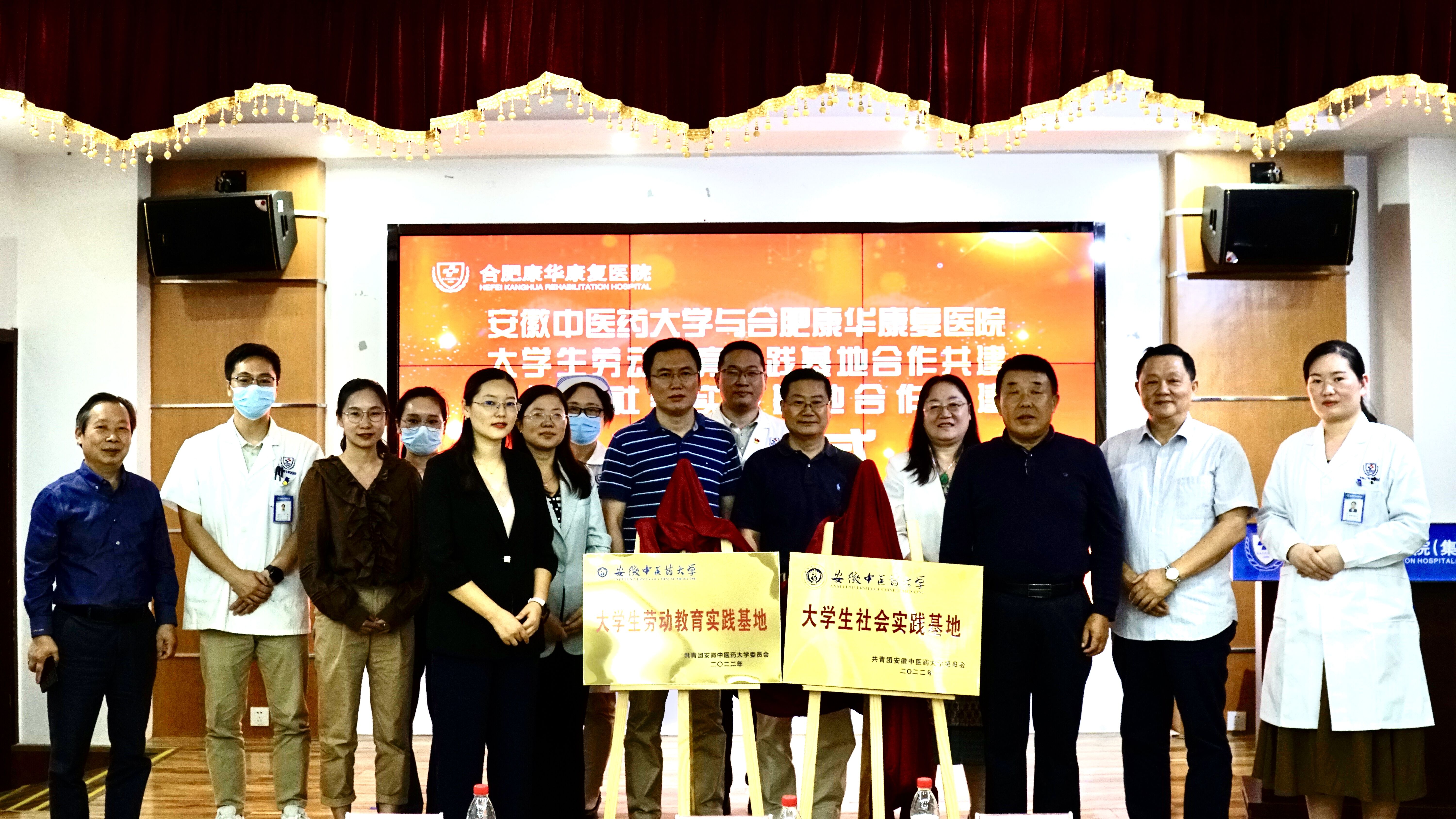 为持续深入推进学校“大医精诚”实践育人工程,加强校地联合,传承与创新中医药文化,9月23号下午,安徽中医药大学(中西医结合学院)大学生社会实践基地、大学生劳动教育实践基地授牌仪式在合肥康华康复医院举行。校团委书记叶兰兰、中西医结合学院党委书记尹必武、中西医结合学院院长蔡标、合肥康华康复医院法定代表理事长吴同新、儿童康复科负责人卢红云、中西医结合康复治疗部主任高顶平(中西医结合学院2009届校友)及毕业生代表、实习同学等出席仪式,仪式由医院执行院长郭毅主持。