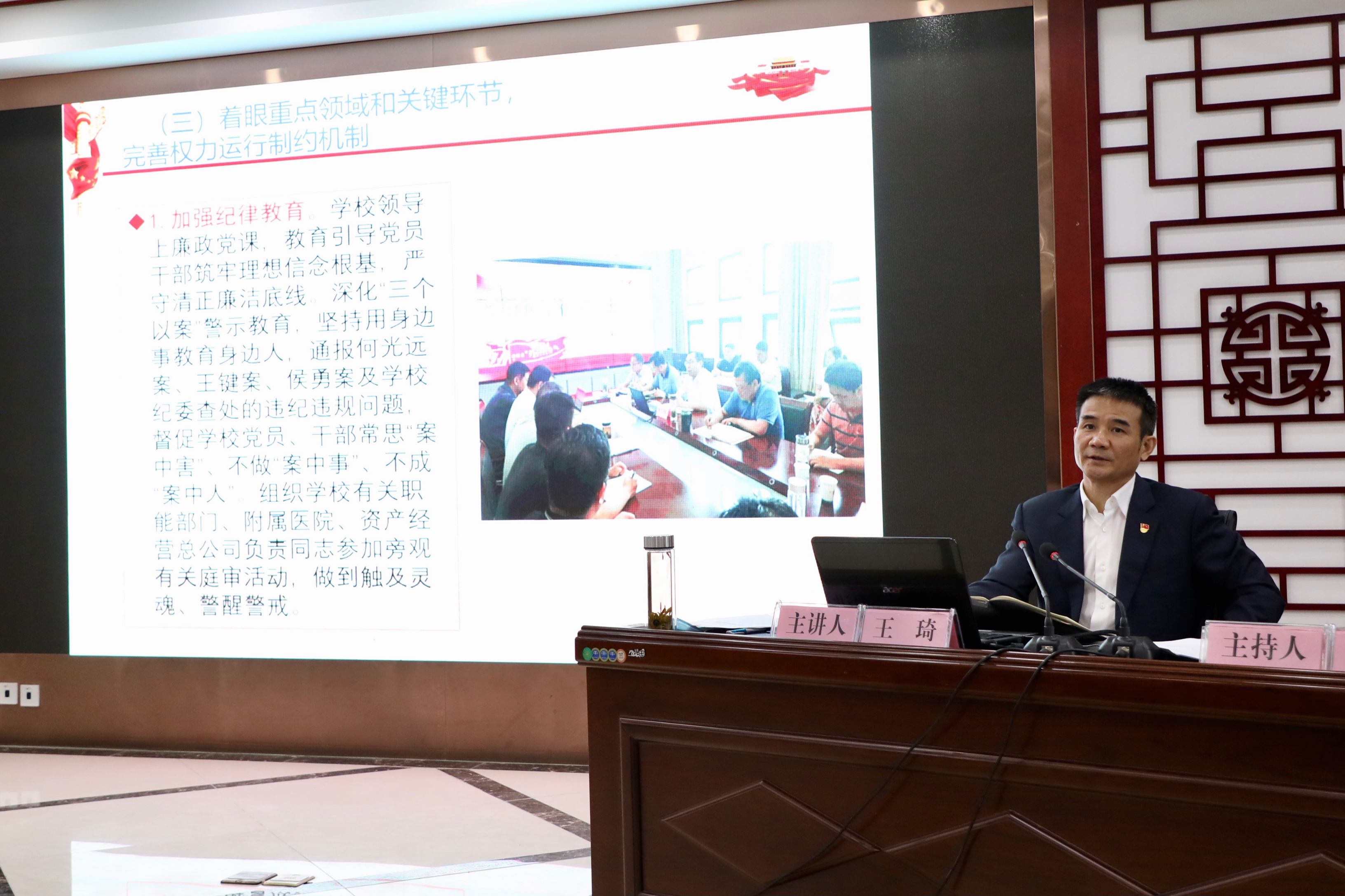 报告围绕“自我革命的内涵与意义、全面从严治党的学校实践、以自我革命精神纵深推进全面从严治党”三个方面展开。王琦指出,自我革命是通过向内追寻以解决自身存在的问题,不断实现自我净化、自我完善、自我革新、自我提高的过程。勇于自我革命,是我们党最鲜明的品格,也是我们党最大的优势。全面从严治党是新时代党的自我革命的伟大实践。是一场主动为之、刀刃向内的自我革命,是在新时代、新形势、新任务下对自我革命精神的坚持与发扬。党的十八大以来,以习近平同志为核心的党中央坚定不移正风肃纪反腐,全面从严治党取得历史性、开创性成就,产生全方位、深层次影响,探索出依靠党的自我革命跳出历史周期率的成功路径。在党中央和省委坚强领导下,学校全面从严治党取得了一定成绩,管党治党责任体系进一步完善,制度机制更加完备,权力运行更加规范,广大师生医护员工纪法意识不断增强,党风校风学风持续转化优化,校园政治生态不断向善向好。
