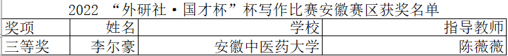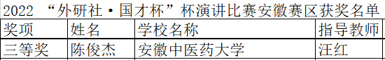 10月27日至29日,2022年“外研社•国才杯”全国大学生英语挑战赛安徽赛区决赛顺利开赛,来自全省各高校选手们同台竞技,大赛精彩纷呈。经过激烈角逐,我校中医学院2021级中医学专业陈俊杰同学荣获演讲比赛安徽赛区决赛三等奖;人文与国际教育交流学院2021级应用心理专业李尔豪同学荣获写作比赛安徽赛区决赛三等奖。“外研社·国才杯”大学生英语挑战赛是全国规模最大、范围最广、规格最高、影响最深的英语大赛。自2019年起,挑战赛演讲、写作、阅读三大赛事同登教育部高等教育学会“中国高校创新人才培养暨学科竞赛排行榜”,也是唯一被纳入的英语类竞赛。