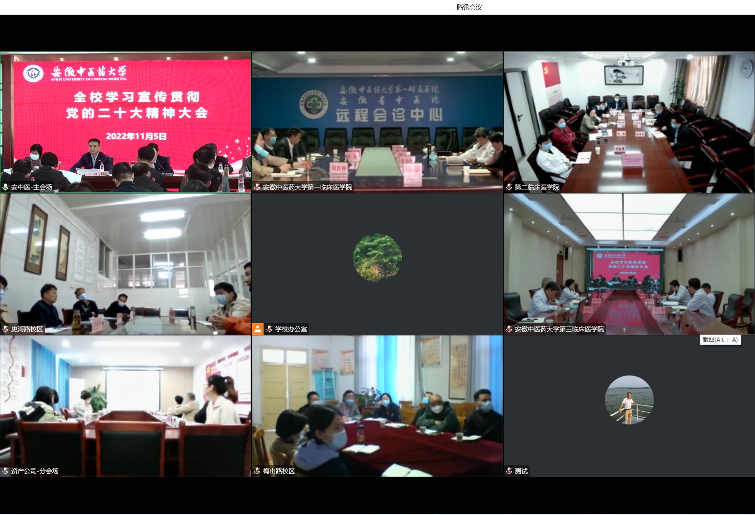 全校学习宣传贯彻党的二十大精神大会以线上、线下相结合形式召开,少荃湖校区为主会场,梅山路校区、史河路校区,第一、二、三临床医学院,校资产经营有限公司分别设分会场。各部门、各单位处级干部,各二级党委(党总支、直属党支部)班子成员,省人大常委会委员、省政协委员、校各民主党派主委、各统战团体负责人参加会议。(刘晨/文图编发 吴达武/审核)