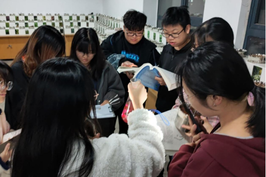 正在学习中药鉴定学课程的学子在理论结合实物辨药
