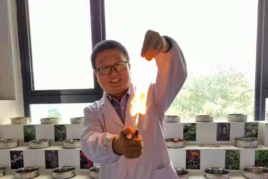 志愿者讲解员展示秦皮水试在阳光下产生的碧蓝色荧光