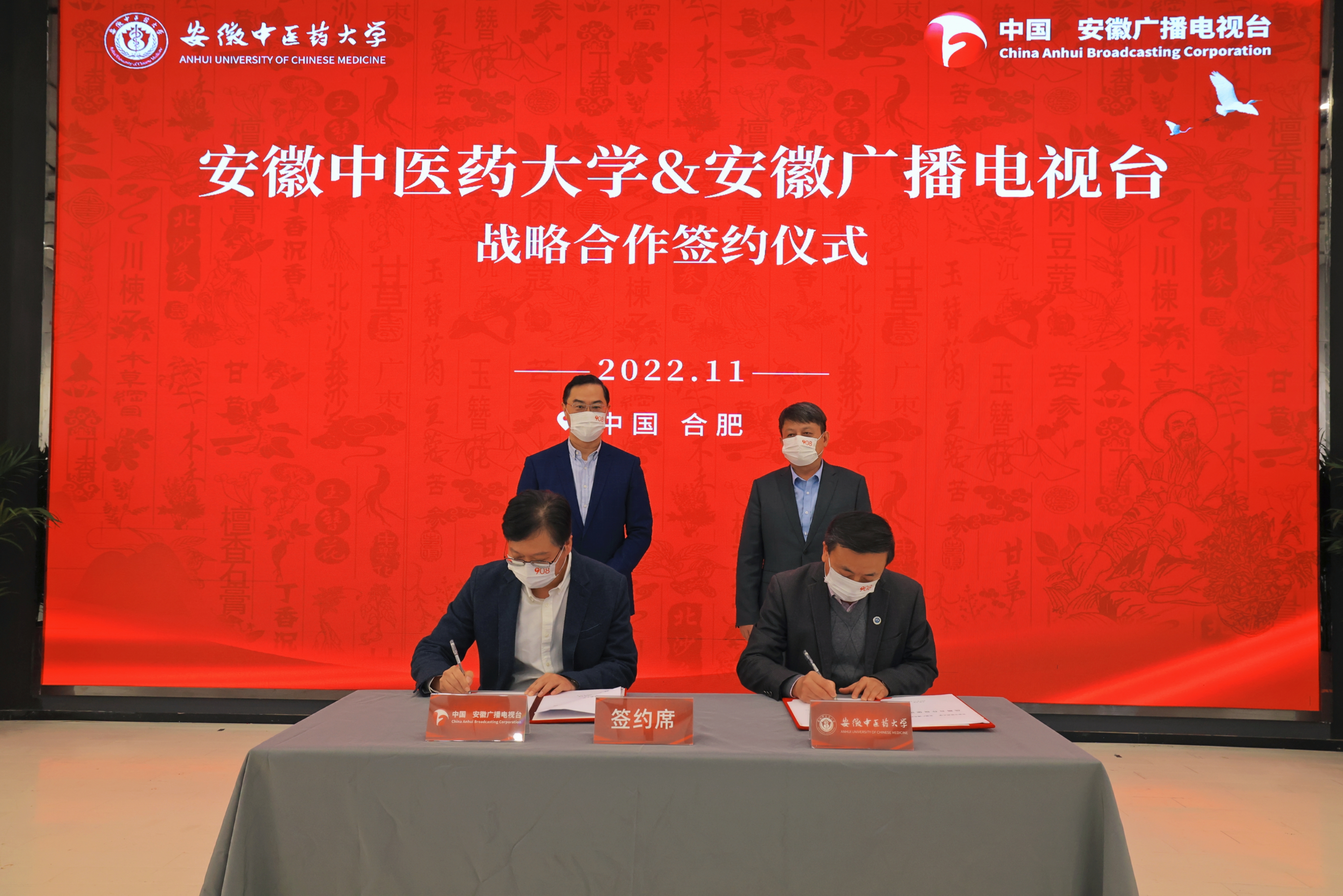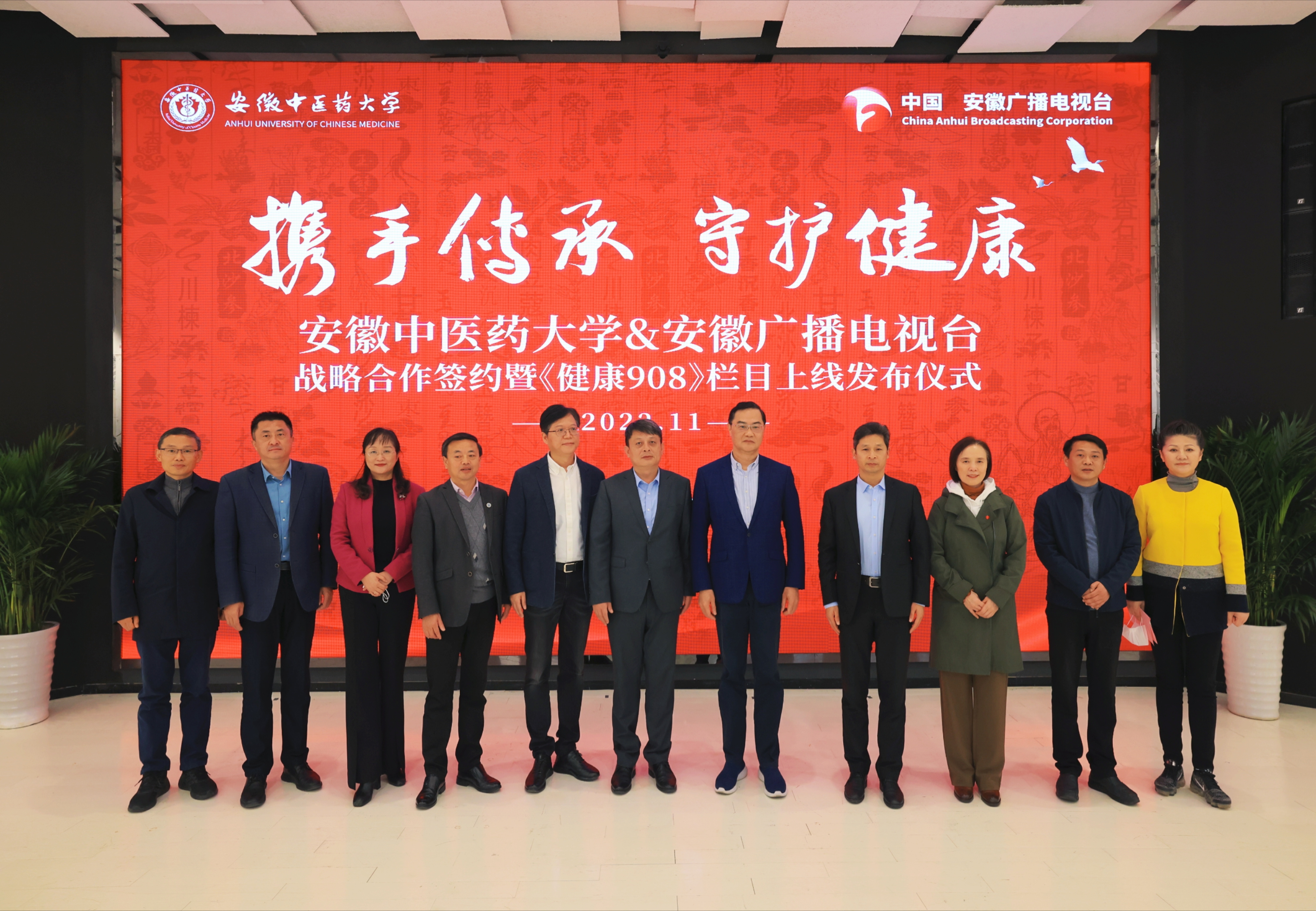 11月14日,我校与安徽广播电视台正式签署战略合作协议,双方共同打造的国内首档全媒体中医健康互动节目《健康908》同期上线。安徽广播电视台党委委员、副台长张阿林,学校党委常委、副校长许钒分别致辞。学校党委常委、宣传部部长吴达武与安徽交通广播总监邵震分别代表双方签署协议。