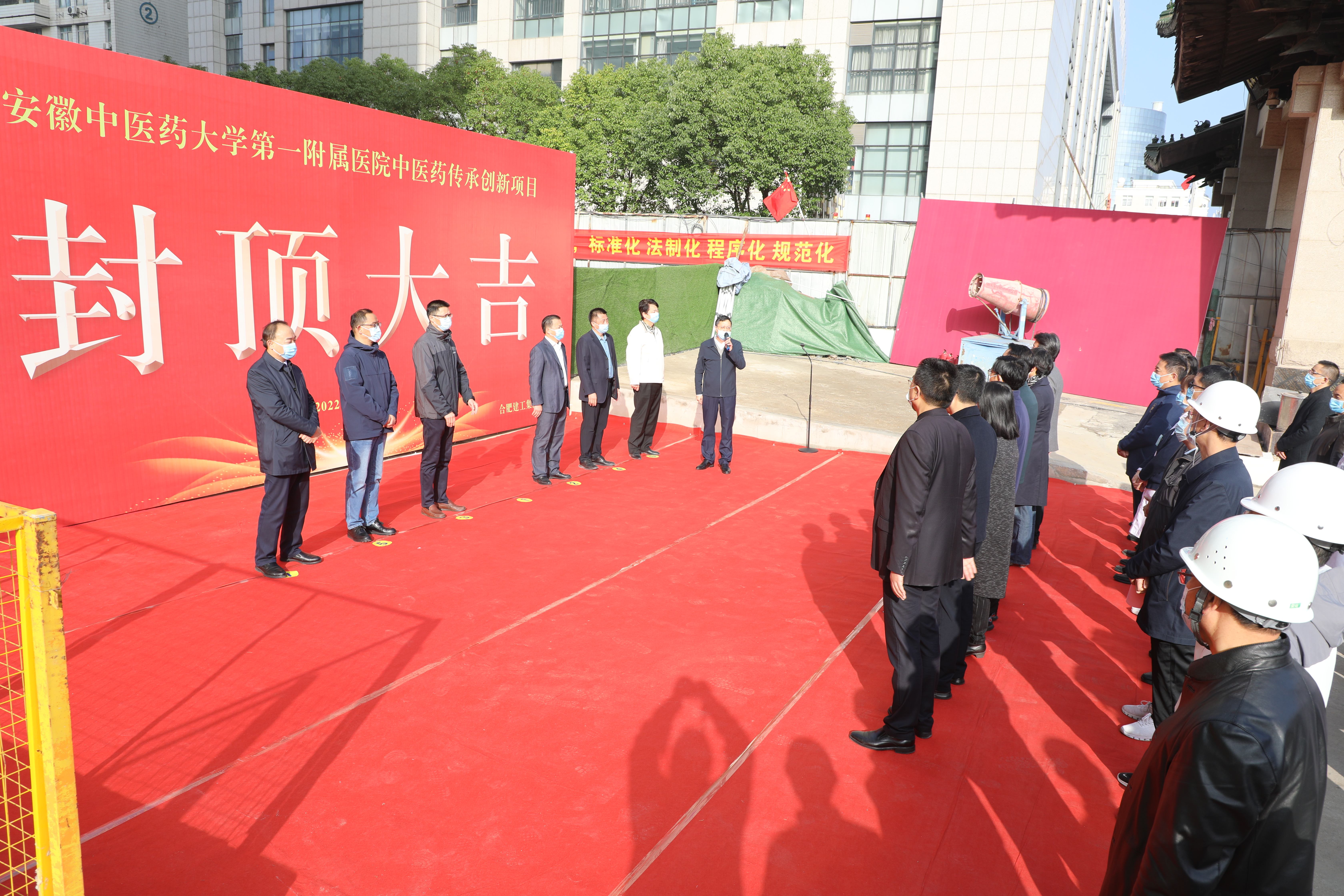 仪式上,张永群宣布大楼封顶。他指出,大楼的建设离不开省发改委、省卫生健康委、蜀山区等各级政府主管部门的重视和支持,离不开各参建单位建设者们的辛勤劳动。他表示,学校将举全校之力支持医院建设发展,希望各参建单位进一步严把安全质量关、保证施工进度,加强协同合作,力争将安徽中医药大学第一附属医院中医药传承创新大楼建成精品工程、放心工程。