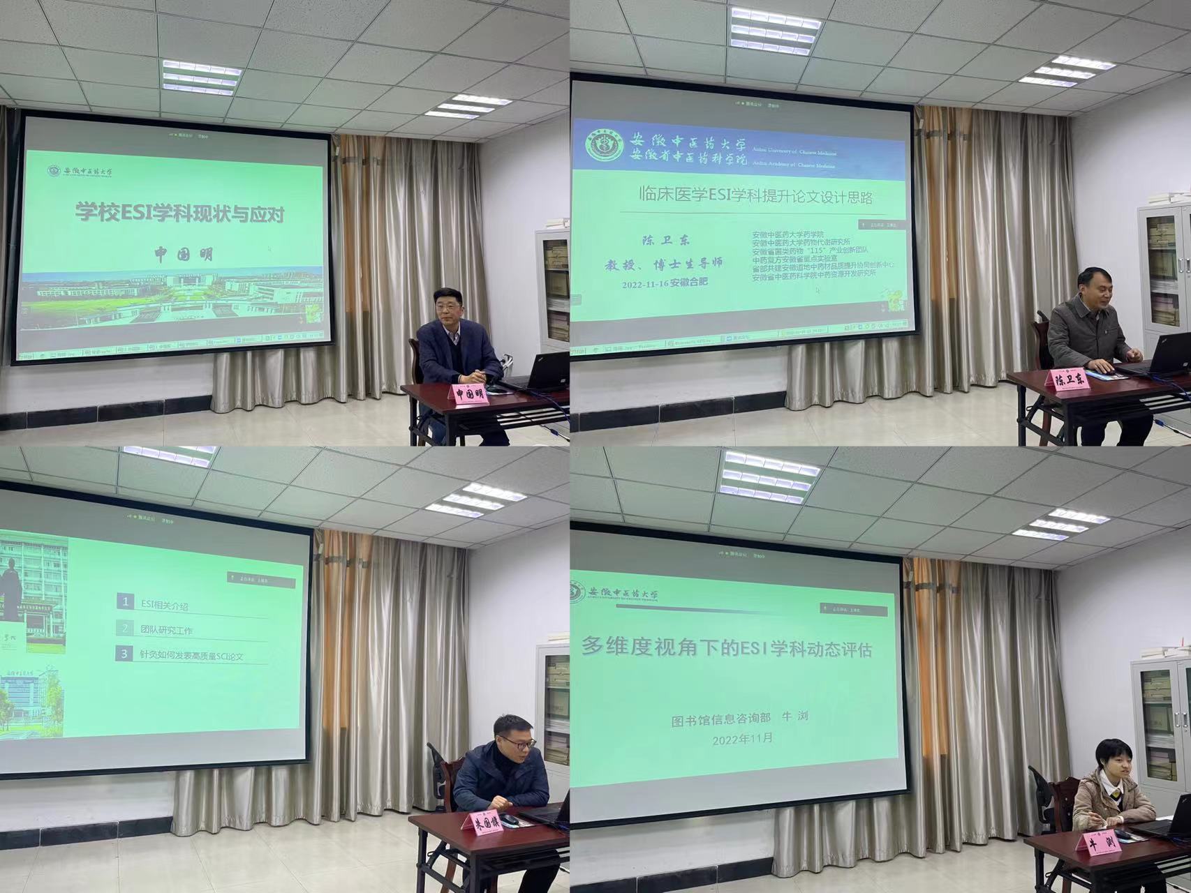 11月16日下午,学校学科建设办公室、图书馆、第二临床医学院在第二附属医院共同举办ESI学科提升系列讲座。讲座采取线上和线下结合的方式举行,校学科建设办主任申国明教授、药学院陈卫东教授、中医学院朱国旗教授、图书馆牛浏老师分别进行了专题演讲,第二临床医学院负责人及各相关学科带头人、学科骨干参加了线下讲座,其他相关学科人员参加了线上讲座。