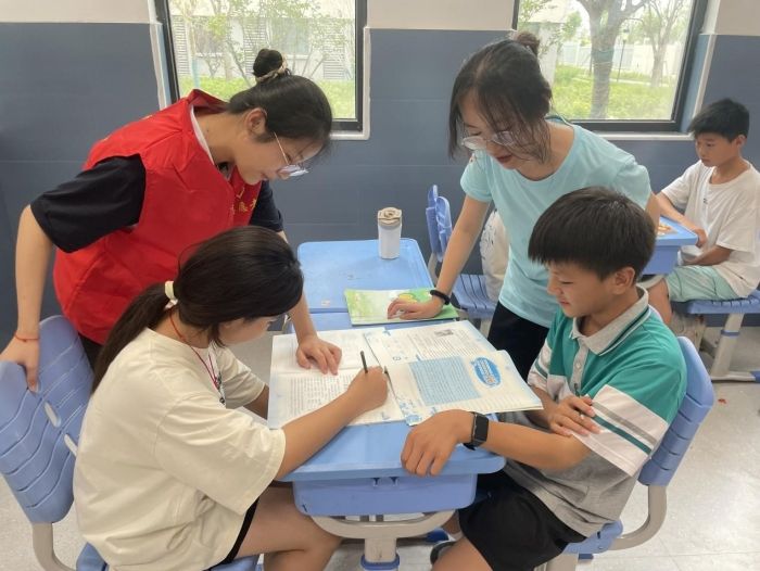 “起势调息、上提、下按、虎举、握拳……”7月11日,在淮海绿地21城实验学校操场上,一群少年时而身体后仰、时而含胸收腹、时而退步划弧,这是该校学生正跟随支教志愿者的口令练习“五禽戏”。学生在增强自身身体素质的同时,更切身体会到中华优秀传统文化的博大精深。志愿者带领孩子们在篮球场上奋力投篮,挥洒汗水,下蹲,跳跃,投篮;羽毛球赛中,一个个羽毛球凌空飞舞,挥手如风。孩子们肆意舒展着自己的身体,丰富了“双减”政策下的暑期生活,展现青春生机与活力。志愿始于心,义诊在于行,伴随着清晨第一缕阳光,团队志愿者们在校门口摆台,为来往家长,校园保安进行量血压、测血糖、拔罐、艾灸等义诊健康服务。缕缕艾草香,青春奉爱心。