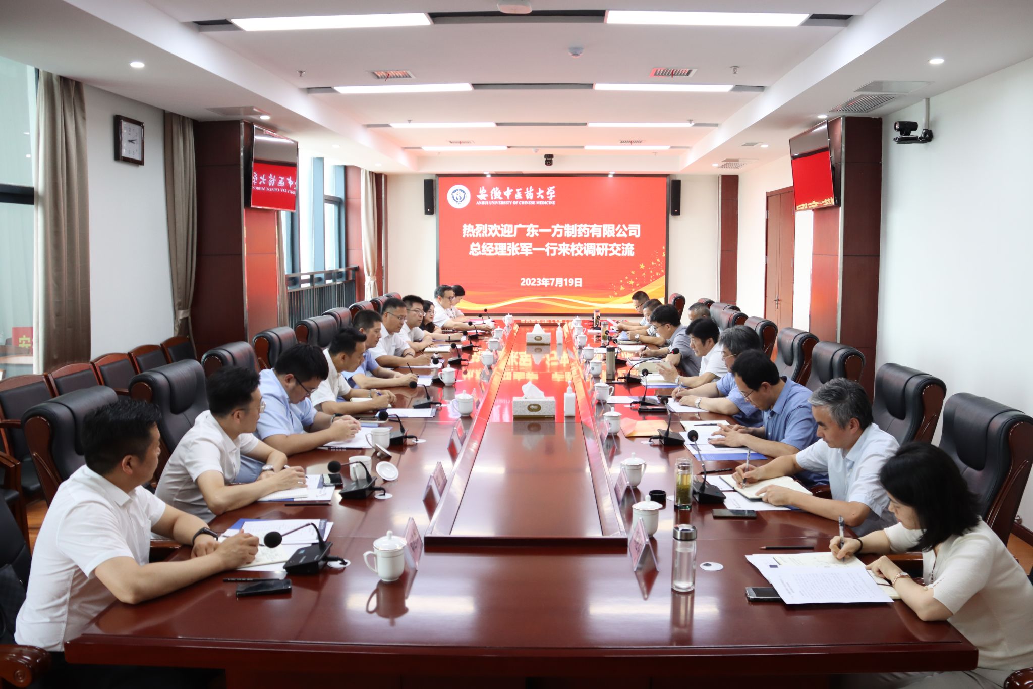 7月19日,广东一方制药有限公司总经理张军一行来校调研交流,校党委副书记、校长彭代银,党委常委、副校长魏骅,广东一方制药有限公司副总经理刘斌,华东大区、安徽大区、人力资源中心、药材资源中心、技术中心等负责人,学校办公室、教务处、研究生院、学生处、科技处、医院事务管理处、基金会等部门负责人参加座谈。