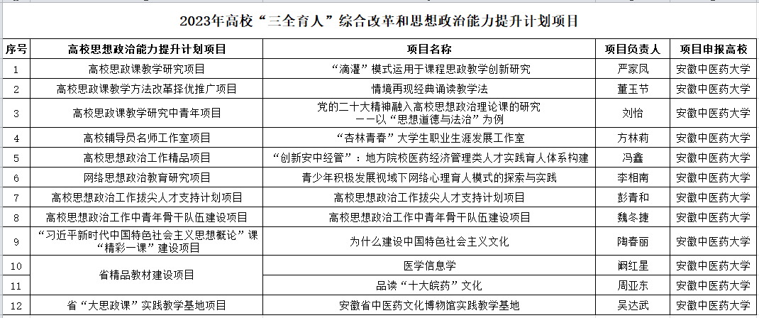 近日,安徽省委教育工委、安徽省教育厅公布了2023年高校“三全育人”综合改革和思想政治能力提升计划项目评审结果,我校12个项目获批立项。