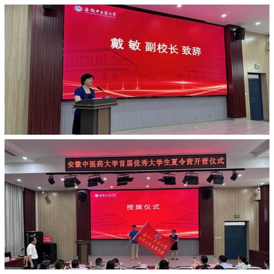 7月24日上午,夏令营在少荃湖校区拉开帷幕,副校长戴敏与来自研究生院、中医学院、中西医结合学院、针灸推拿学院、药学院、第二临床医学院的领导老师参加了开营仪式。戴敏致辞,对此次参加夏令营的同学们表示热烈欢迎,希望营员们通过夏令营更加了解安徽中医药大学和新安医学,有所感悟与收获,积极加入到安中医这个大家庭。随后戴敏为夏令营团队授旗。
