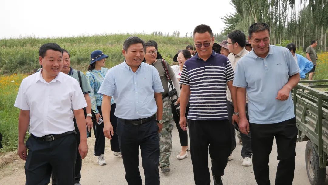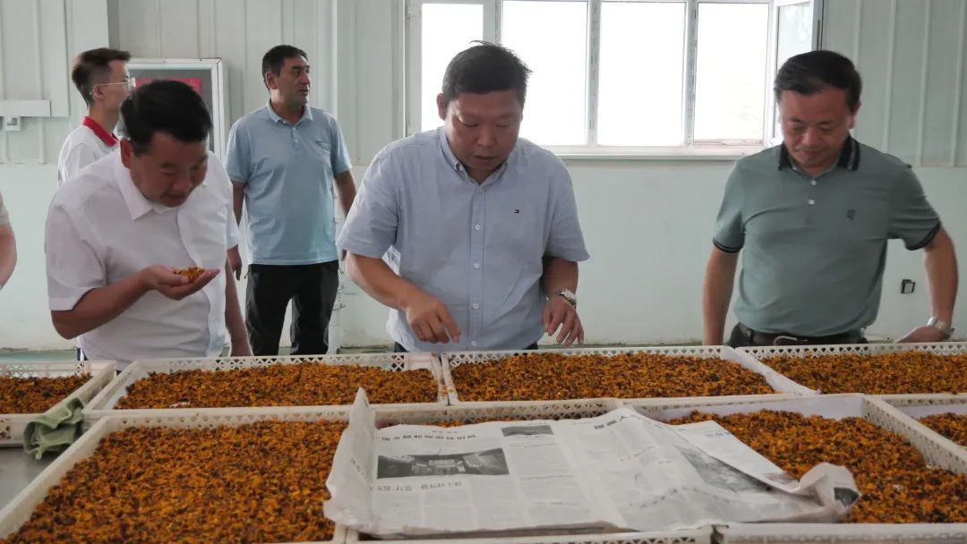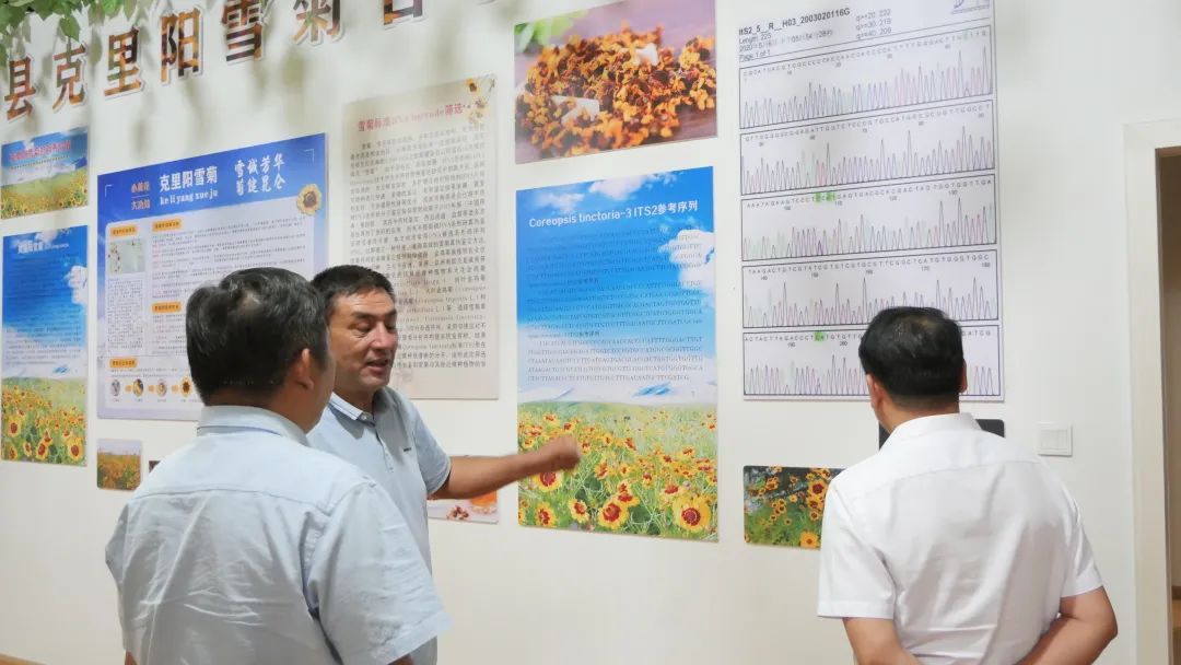 会议开始之前,学校慰问团和暑期社会实践大学生科考队前往皮山县克里阳乡“雪菊种植基地”开展暑期“三下乡”社会实践活动。他们深入田间地头,实际调研雪菊的栽培管理技术,对雪菊的种源、种植和生长情况做了现场考察,指导老师杨青山带领团队成员为种植户进行田间指导。紧接着,来到皮山县克里阳雪菊综合合作社雪菊加工工厂,参观雪菊原料加工、晾晒生产的相关过程。