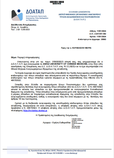 2023年12月15日,经希腊共和国国家学术认可与信息中心全会审核通过,我校被列入该国《外国认可大学名录》。