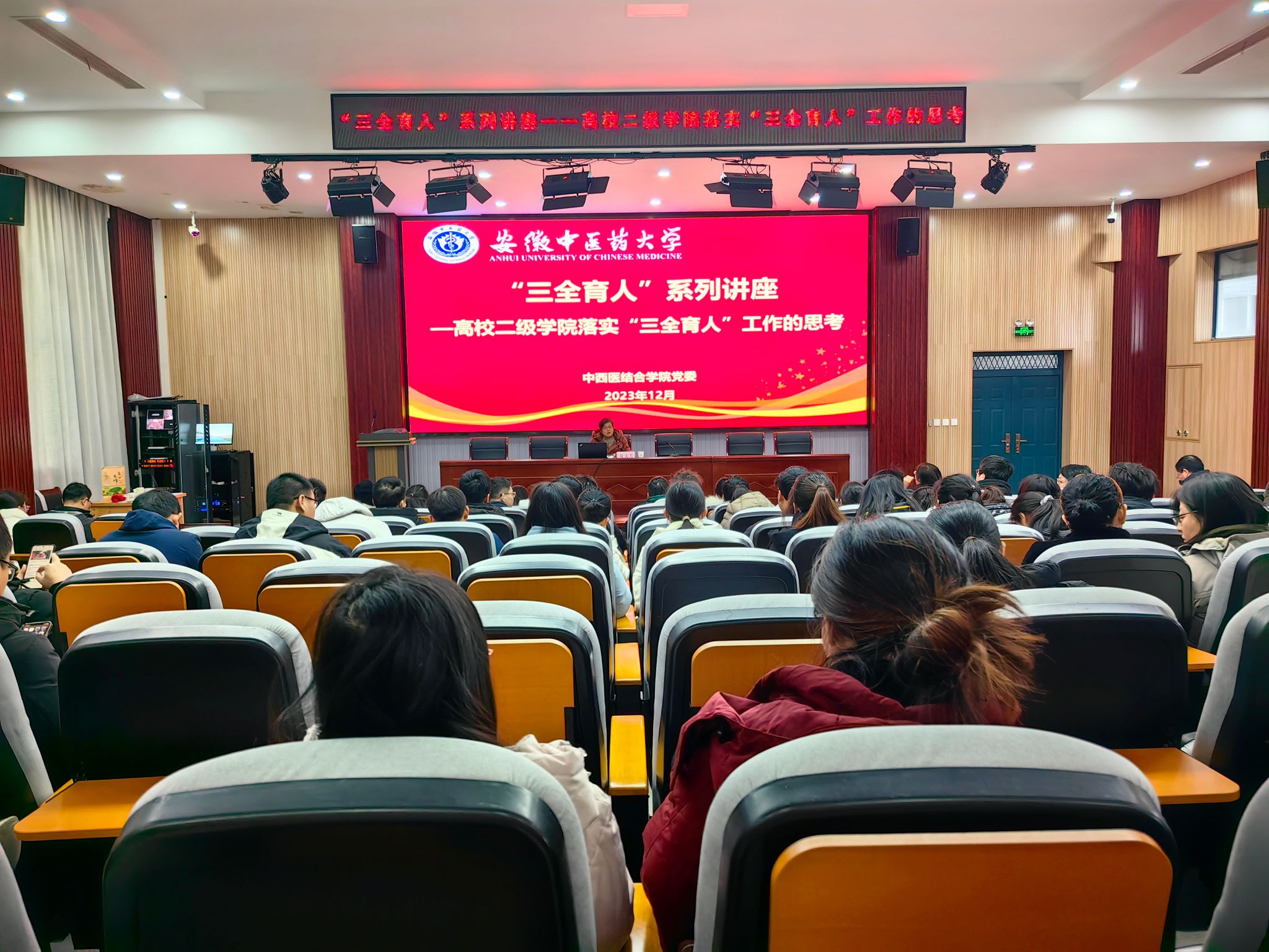 夏文芳以《高校二级学院落实“三全育人”工作的思考》为题为中医学院和中西医结合学院全体教职工作了专题报告,介绍了“三全育人”理念的历史发展、落实“三全育人”工作的思考以及三全育人的典型做法。