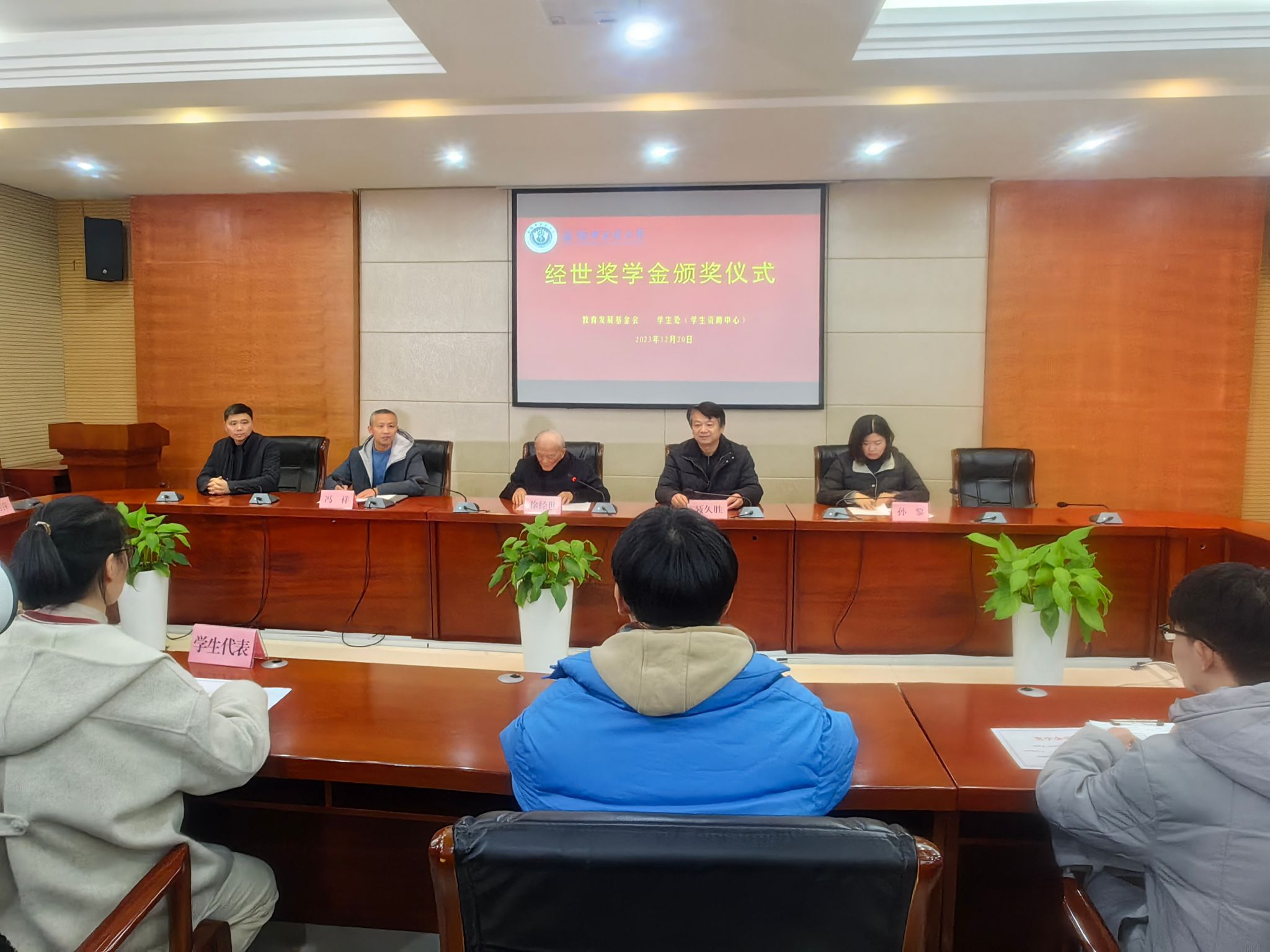 12月20日下午,学校在梅山路校区新安楼一楼会议室举行2022-2023学年“经世奖学金”颁奖仪式,国医大师徐经世,学校党委常委、第一临床医学院党委书记聂久胜,学校办公室、学工部相关负责人、辅导员代表出席了本次颁奖仪式。会议由学工部部长冯祥主持。