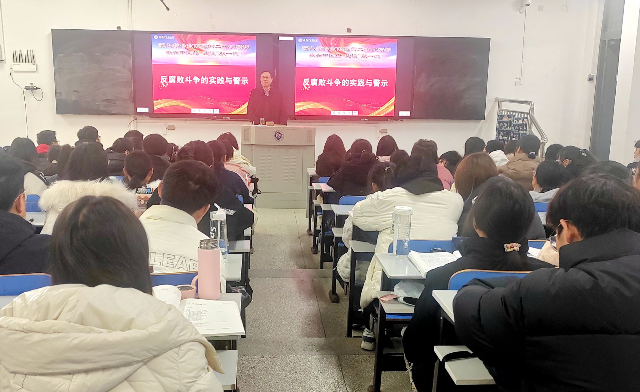 12月1日,学校党委常委、纪委书记、省监委驻学校监察专员石金明为中西医结合学院2023级中西医临床医学专业学生讲授《反腐败斗争的实践与警示》专题。他从新时代反腐败斗争新特点、新时代反腐败斗争新成效、党的二十大反腐败斗争新部署以及新时代反腐败斗争新警示等四个维度进行系统讲解,授课内容聚焦当下时事热点,引用大量现实案例,引发学生思考。最后,他以身边人和事为例,呼吁青年学子要坚定信念、筑牢防线,修身养德、远离红线,知行合一、不破底线。