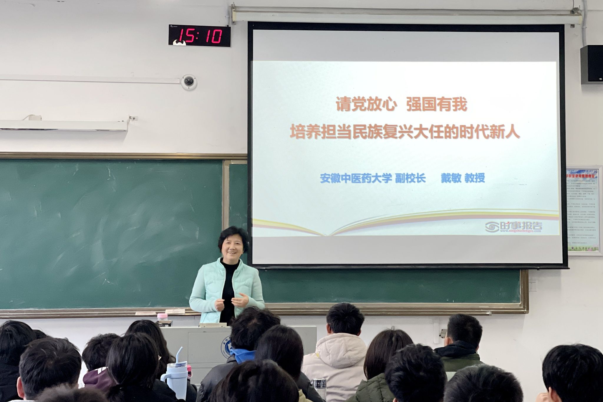 12月6日,副校长戴敏为体育健康学院2023级运动康复专业学生讲授《请党放心 强国有我,培养担当民族复兴大任的时代新人》专题。她结合习近平总书记关于教育的重要论述,围绕“高等教育发展新时代、世界高等教育发展趋势、培育时代新人”展开论述,回顾了我国高等教育改革发展的奋进之路,分析了当前世界高等教育的新形势,强调高等教育事业发展对全面推进中华民族伟大复兴的重大意义。戴敏在师生互动中了解学生的人生理想与追求,引导学生思考人生奋斗的目标和意义,鼓励学生努力成长为有理想、有学问、有才干的实干家,要在中国式现代化建设中挺膺担当。