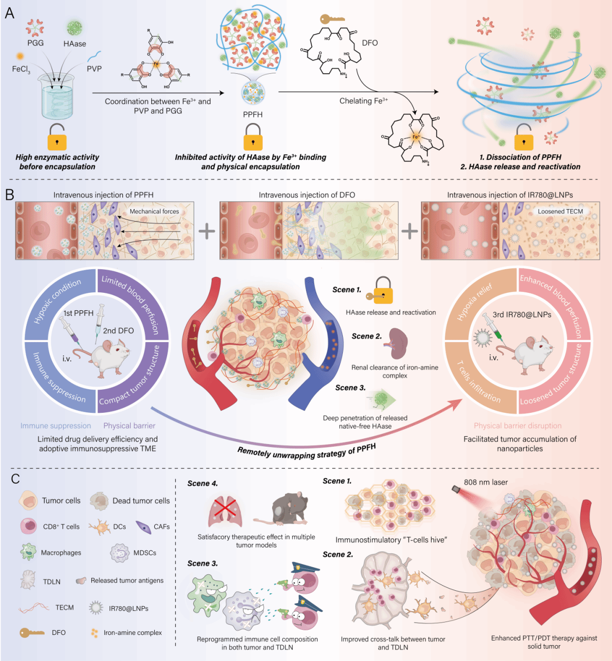 实体肿瘤的治疗往往受到紧凑和坚硬的肿瘤细胞外基质(TECM)的阻碍。透明质酸酶(HAase)与纳米技术联合精确降低TECM是实体肿瘤治疗的有效策略,但透明质酸酶的肿瘤靶向递送仍然是一个巨大的挑战。受铁中毒治疗的启发,该论文基于中药活性成分PGG提出了一种远程拆解金属-多酚网络并激活其内部封装HAase(称为PPFH)的策略,即依次注射PPFH和临床使用的铁螯合剂去铁胺(DFO)。静脉注射DFO可迅速螯合PPFH结构中的铁离子,触发PPFH结构分解,进而导致被包裹的HAase在肿瘤内释放、重新激活和深度穿透。该论文介绍的HAase递送策略极具成本效益,不涉及复杂的有机合成方案,并且不受肿瘤异质性的限制;同时显著地改善了后续的光热和光动力治疗(PTT/PDT)诱导的肿瘤内细胞毒性T淋巴细胞浸润和肿瘤引流淋巴结(TDLN)之间的交互作用,从而减少免疫抑制并优化杀瘤免疫反应,在多种小鼠肿瘤模型中实现有效的肿瘤消融,并使其免受肿瘤转移和复发。本研究已申请国家专利1项,前期许钒教授从中药复方研究中发现五没食子酰葡萄糖(PGG)具有抗肿瘤和抑制丝氨酸蛋白酶活性,并申请国家发明专利1项。