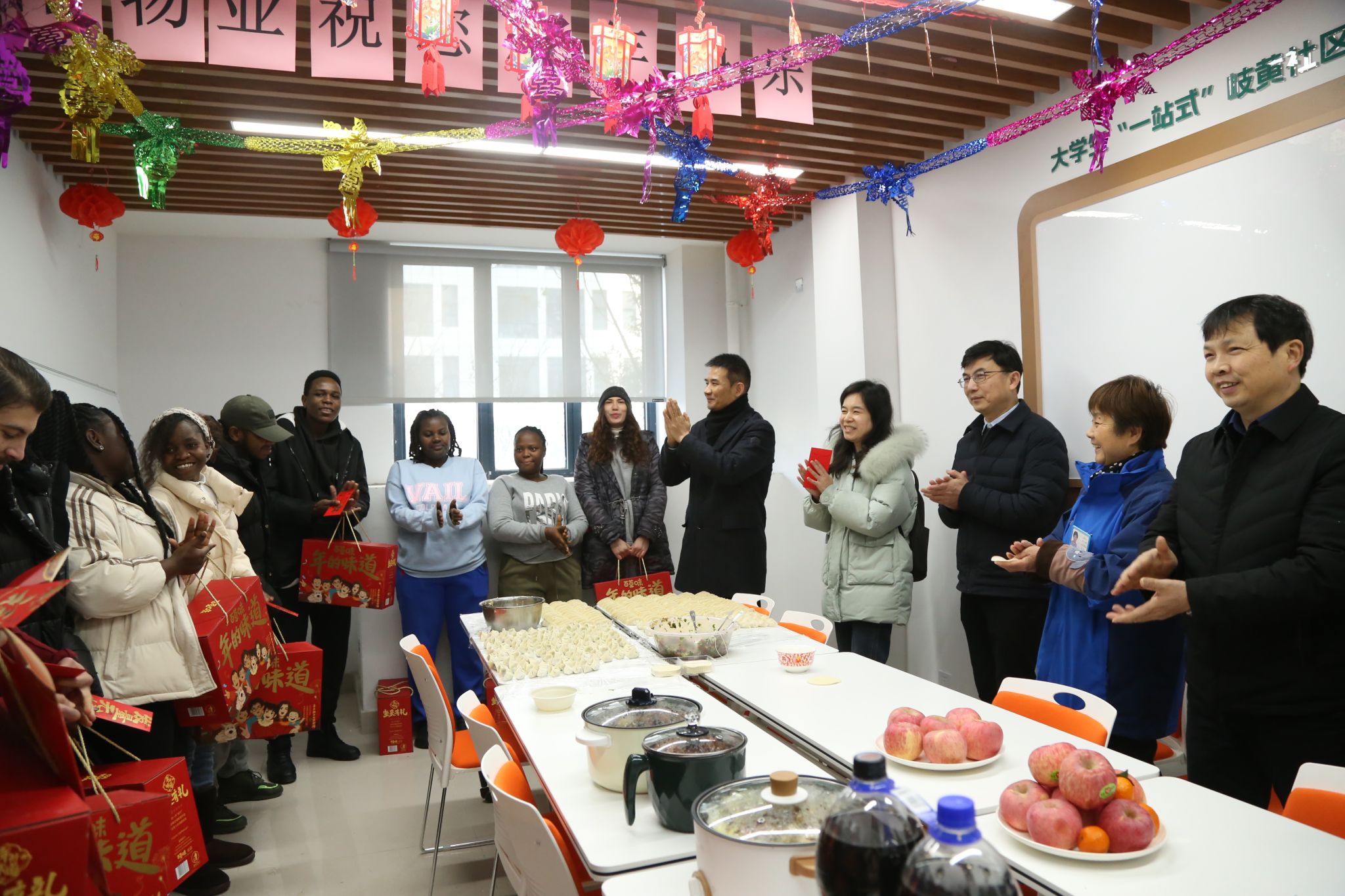 在学生宿舍,王琦与来自摩洛哥、巴基斯坦、津巴布韦等国的留学生们亲切交谈,了解他们在校学习生活和寒假的安排情况,代表学校向同学们致以节日的问候,嘱咐大家在潜心学习专业知识之余,多出门走走,亲身感受中国龙年春节的热闹氛围。王琦为留学生们送上新年礼包和祝福,祝愿同学们学业有成、龙行龘龘。学校总务处和人文与国际教育交流学院特别为留学生准备了丰盛的年夜饭和饺子,陪他们欢度春节。