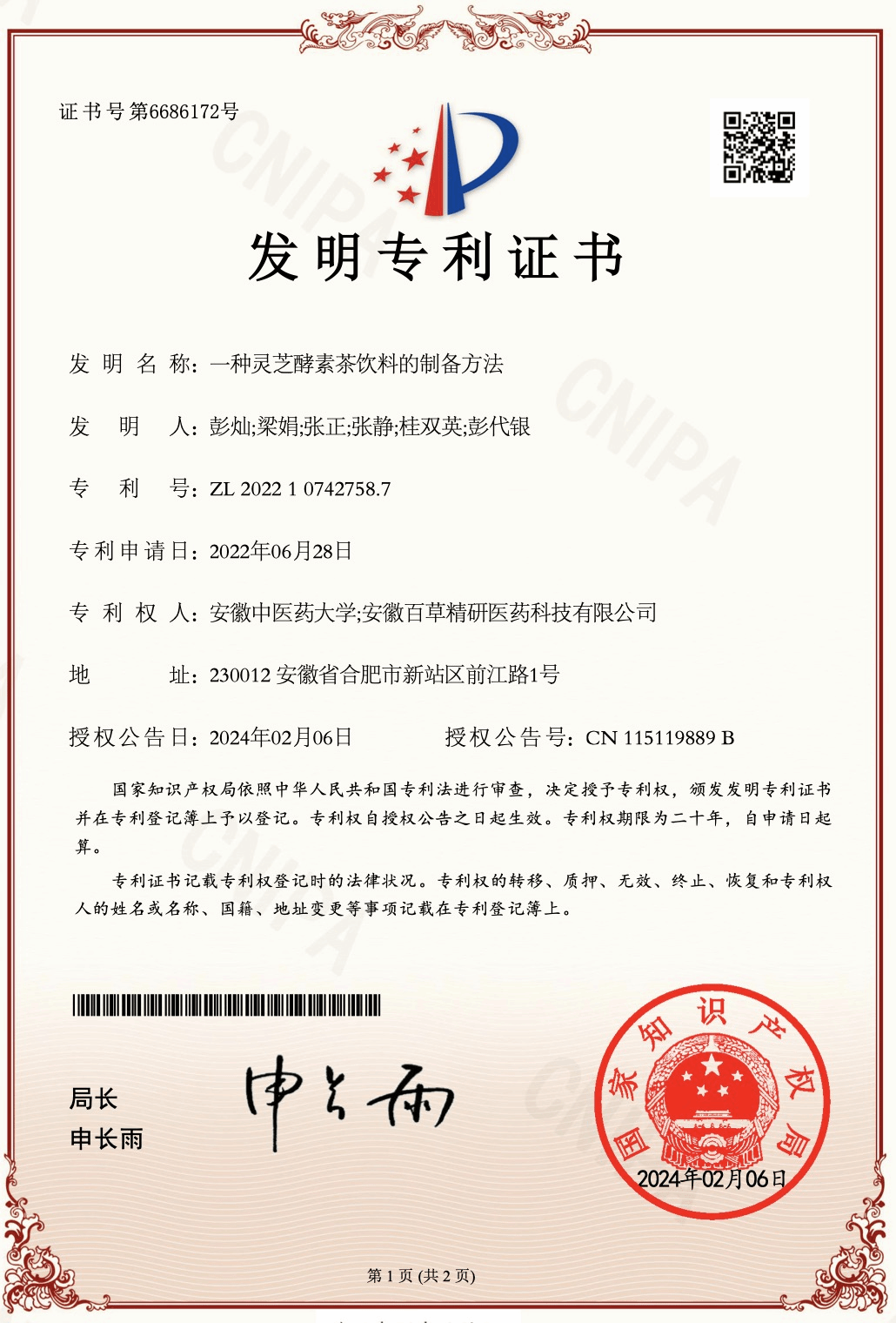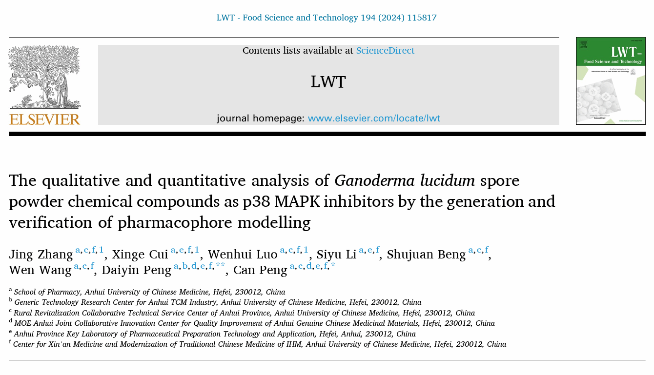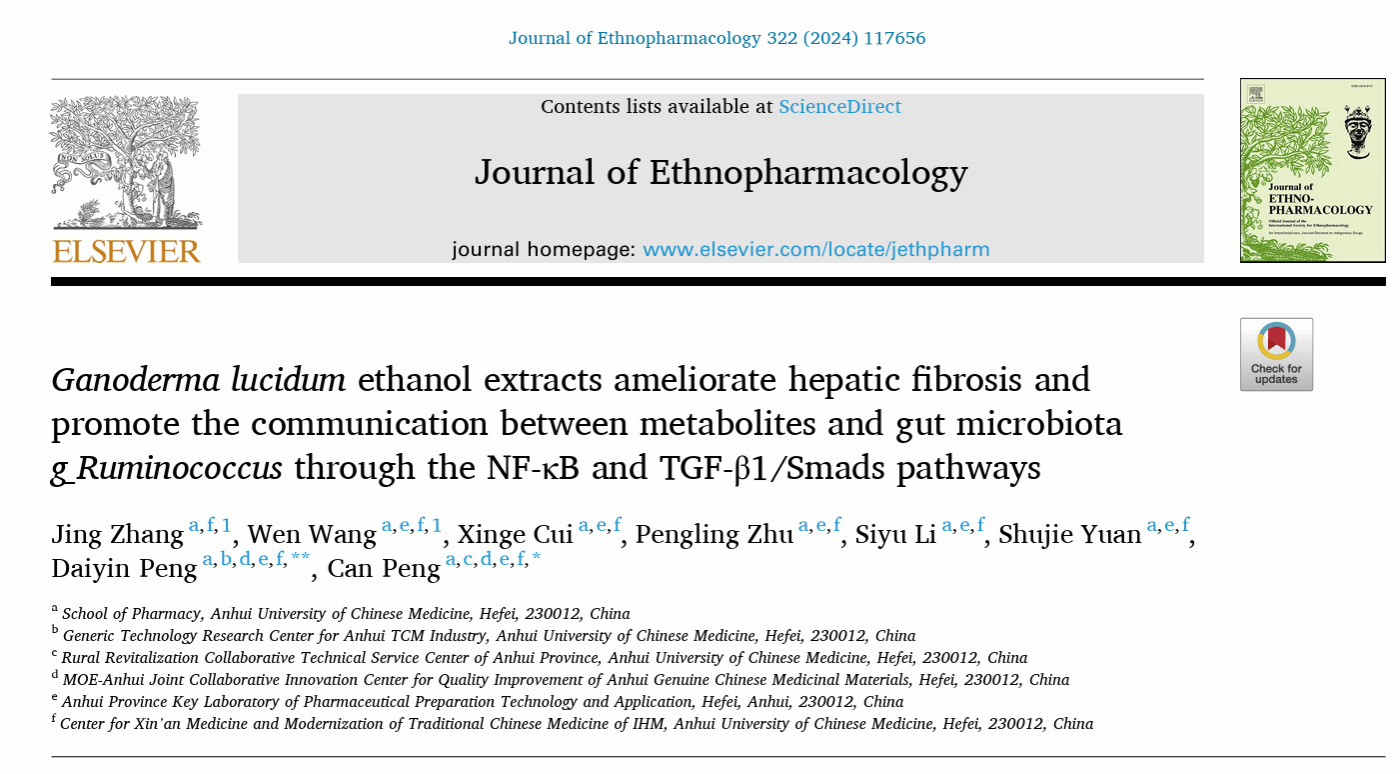 灵芝素有“诸药为各病之药,灵芝为百病之药”的良好美誉,被列为“十大皖药”之一,安徽省特殊的地理环境造就了灵芝的优良品质和药用价值。依托安徽省乡村振兴协同技术服务中心研究平台,我校灵芝研究团队长期开展科技攻关,先后在中科院一区TOP期刊《Journal of Ethnopharmacology》(IF=5.4)和《LWT-Food Science and Technology》(IF=6.0)分别发表题为“Ganoderma lucidum ethanol extracts ameliorate hepatic fibrosis and promote the communication between metabolites and gut microbiota g_Ruminococcus through the NF-κB and TGF-β1/Smads pathways”和“The qualitative and quantitative analysis of Ganoderma lucidum spore powder chemical compounds as p38 MAPK inhibitors by the generation and verification of pharmacophore modelling”高水平研究论文,药学院博士研究生张静、硕士研究生王雯、崔馨戈、罗文慧分别为论文共同第一作者,彭代银教授和彭灿教授作为论文共同通讯作者,安徽中医药大学为论文第一单位。同时,积极将科研成果应用于产品创新,授权国家发明专利1项。