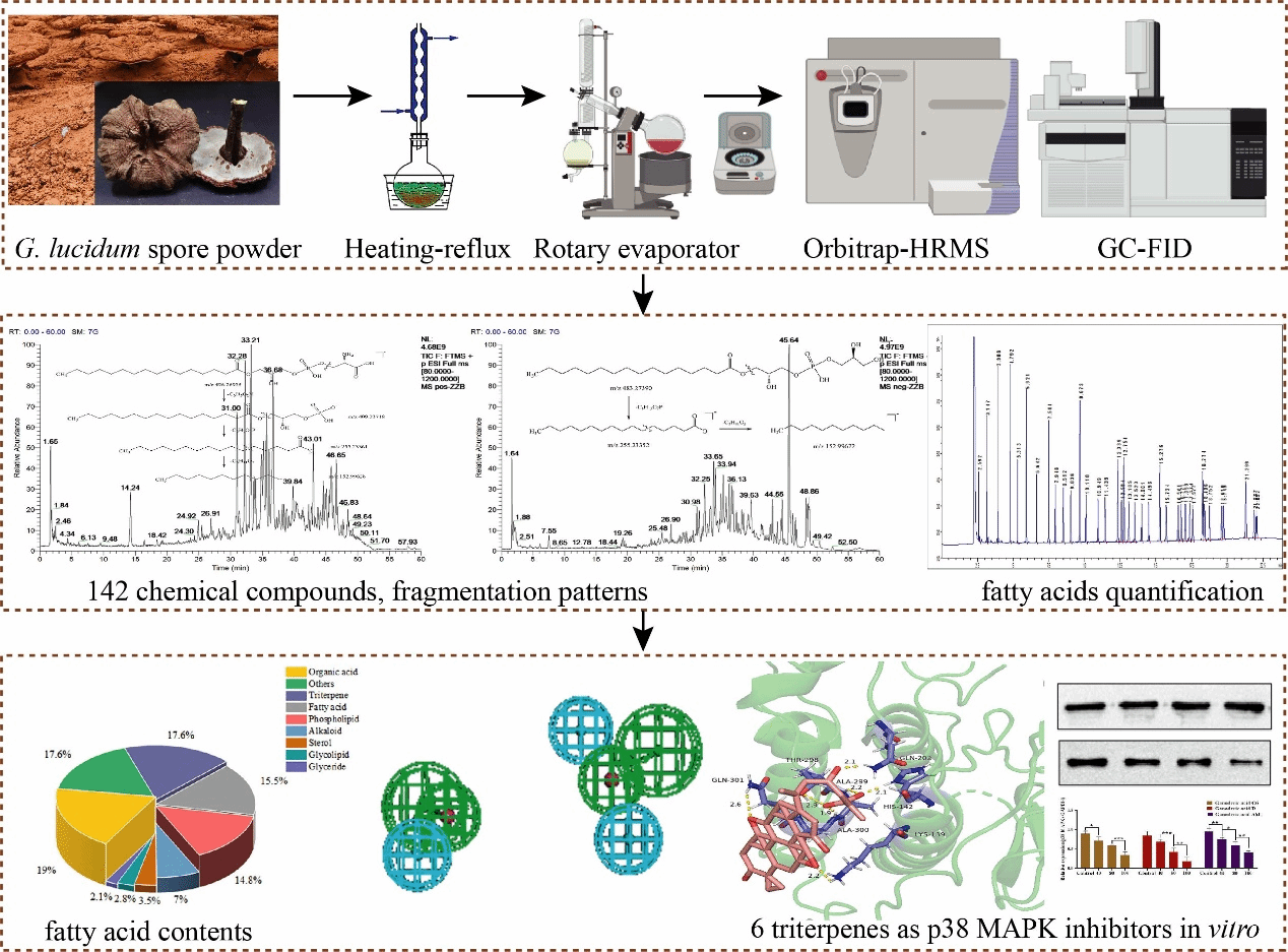 灵芝孢子粉(GLSP)是灵芝在彻底成熟后,菌盖下的菌管中弹射出的细小孢子,具有灵芝的全部遗传物质,作为一种高价值的保健食品和药品,其丰富的活性成分和药理作用已引起广泛关注。目前,GLSP的药效物质基础和质量控制体系方面仍较为模糊,研究采用UPLC-Orbitrap-HRMS法鉴定了GLSP中的142种化学成分,包括55种脂质(3种甘油酯、21种磷脂、4种糖脂、5种甾醇、22种脂肪酸)、25种三萜类化合物、10种生物碱、27种有机酸和25种其他化合物,并总结了12种代表性成分的裂解规律。GC-FID定量分析了赤芝和紫芝孢子粉中的6种不饱和脂肪酸和8种饱和脂肪酸的含量,且两者差异无统计学差异。通过药效团模型和分子对接技术,筛选出7种潜在的p38 MAPK抑制剂。最后,对灵芝孢子粉中的灵芝酸C6、D、G、AM1、灵芝烯酸F、赤芝酸甲酯E2进行了定量分析,并对筛选出的6种三萜类化合物进行了评估,Western Blotting结果表明这6种灵芝三萜类化合物可作为p38 MAPK的潜在抑制剂。