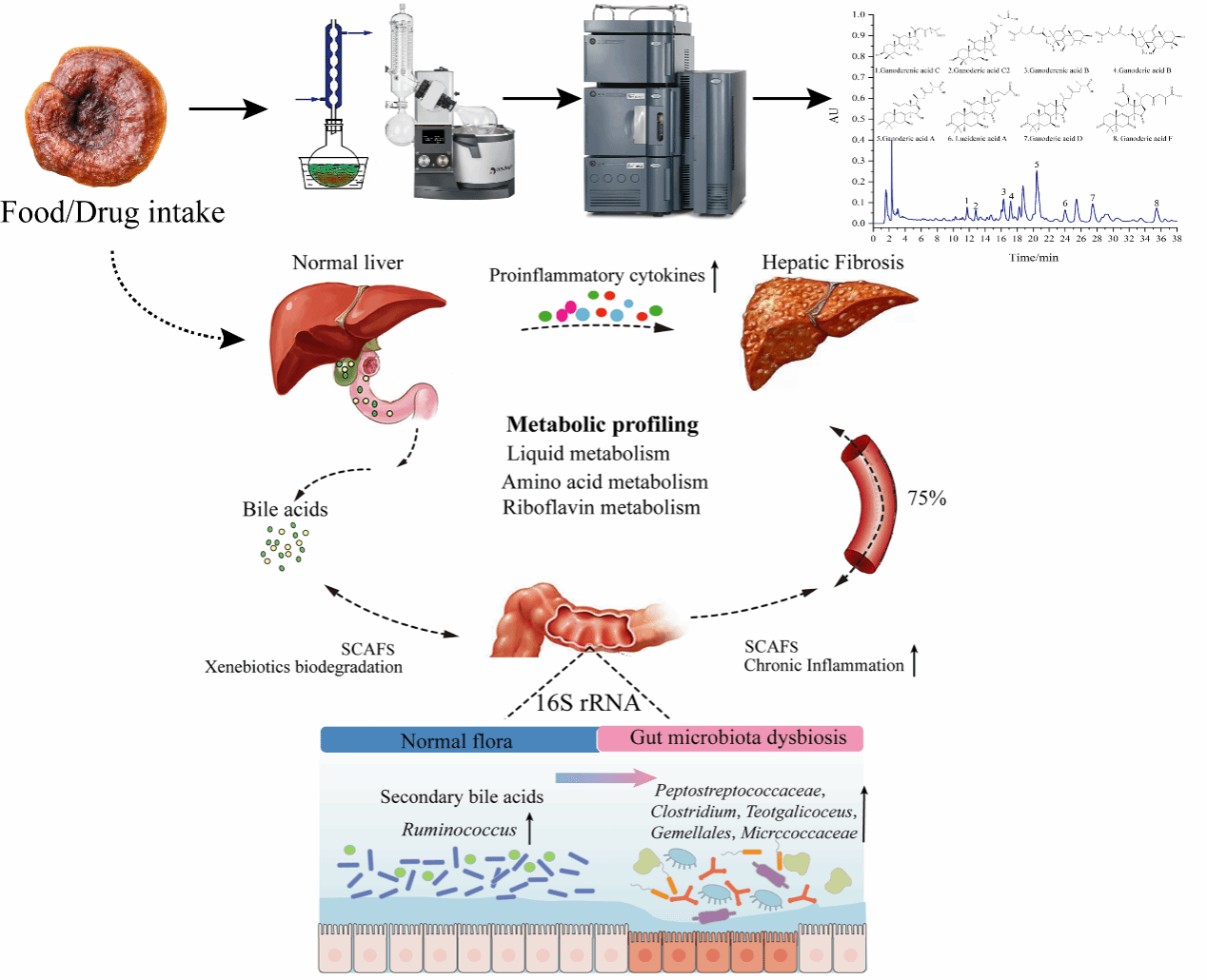 “药食同源”灵芝作为众所周知的真菌之一,其体内代谢物与肠道微生物群相互作用,进而通过“肝-肠轴”发挥显著的保肝护肝功能。灵芝醇提物可通过协同NF-κB和TGF-β1/Smads通路缓解大鼠肝纤维化,降低肝脏病理指标、促炎因子水平和肝脏胶原纤维沉积;UPLC-Q-TOF-MSE非靶向代谢组学分析发现了16种潜在代谢物,可能是与肠道微生物群失调和灵芝醇提物治疗肝纤维化最相关的代谢物;16S rRNA高通量测序结果表明虽然灵芝醇提物对α多样性指数没有显著影响,但肠道菌群组成发生了显著变化;Spearman分析发现内源性代谢物和肠道微生物群g_Ruminococcus与肝纤维化之间显著相关。最终结果表明灵芝醇提取物可通过NF-κB和TGF-β1/Smads途径促进代谢物与肠道微生物群g_Ruminococcus之间的交流并显著改善大鼠肝纤维化。