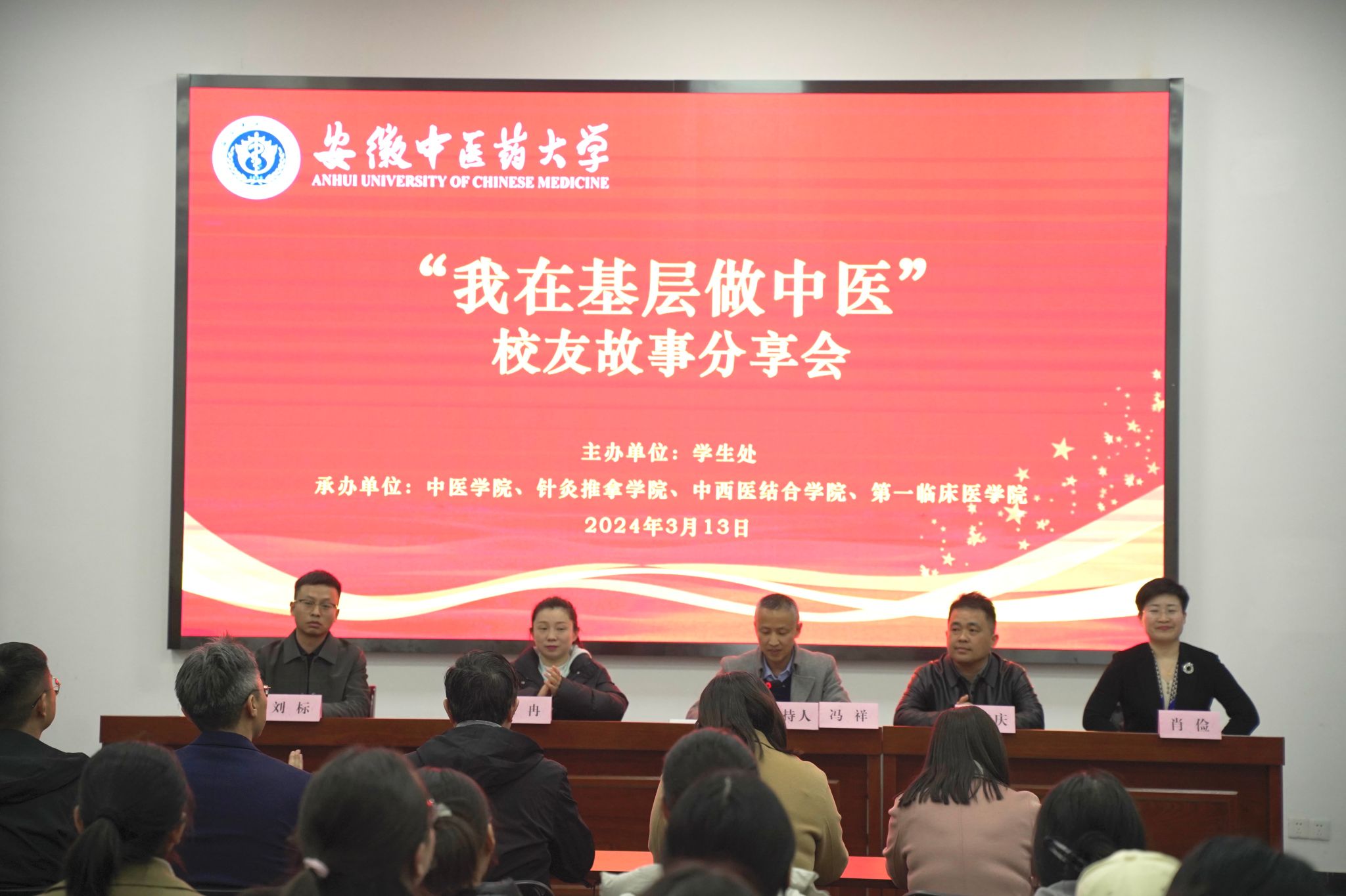 为贯彻落实党和国家推动中医药振兴发展的重大战略部署,吸引中医人才扎根基层,引导鼓励毕业生奔赴基层干事创业。3月13日晚,2024年“我在基层做中医”故事分享会在学校少荃湖校区中医学院宅仁堂报告厅举行。校党委常委、巡察办主任、机关党委书记罗绍明,阜南县中医院副院长董安庆(2009届校友),宿松县中医院主治中医师徐冉(2011届校友),郸城县中医院党委书记肖俭(2008届校友),利辛县中医院党委委员、纪委书记刘标(2012届校友)与学校师生齐聚一堂。
