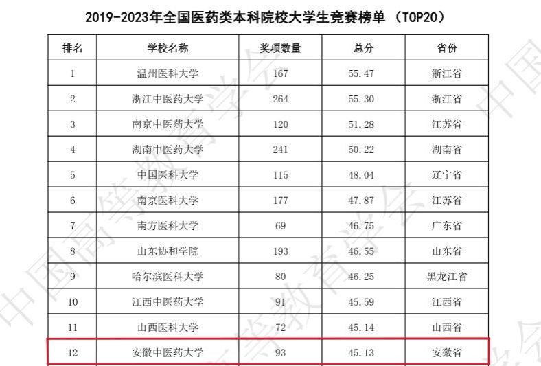 3月22日,中国高等教育学会高校竞赛评估与管理体系研究专家工作组发布《2023全国普通高校大学生竞赛分析报告》(以下简称《分析报告》)。我校在《2019-2023年全国医药类本科院校大学生竞赛榜单(TOP20)》中位列第12位。