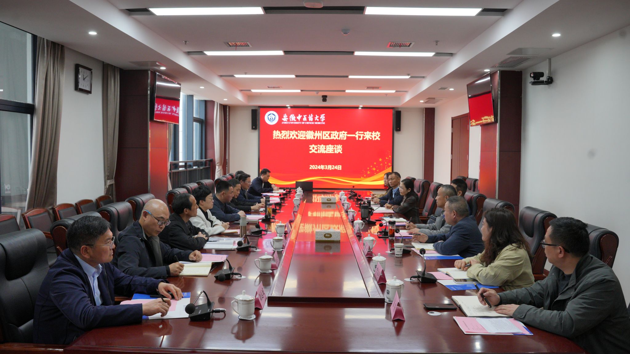 徽州区人社局、徽州区卫生健康委、徽州区人民医院,合肥市第一人民医院,校学生处、资产经营公司、中西医结合学院、针灸推拿学院、第一临床医学院负责人参与座谈。