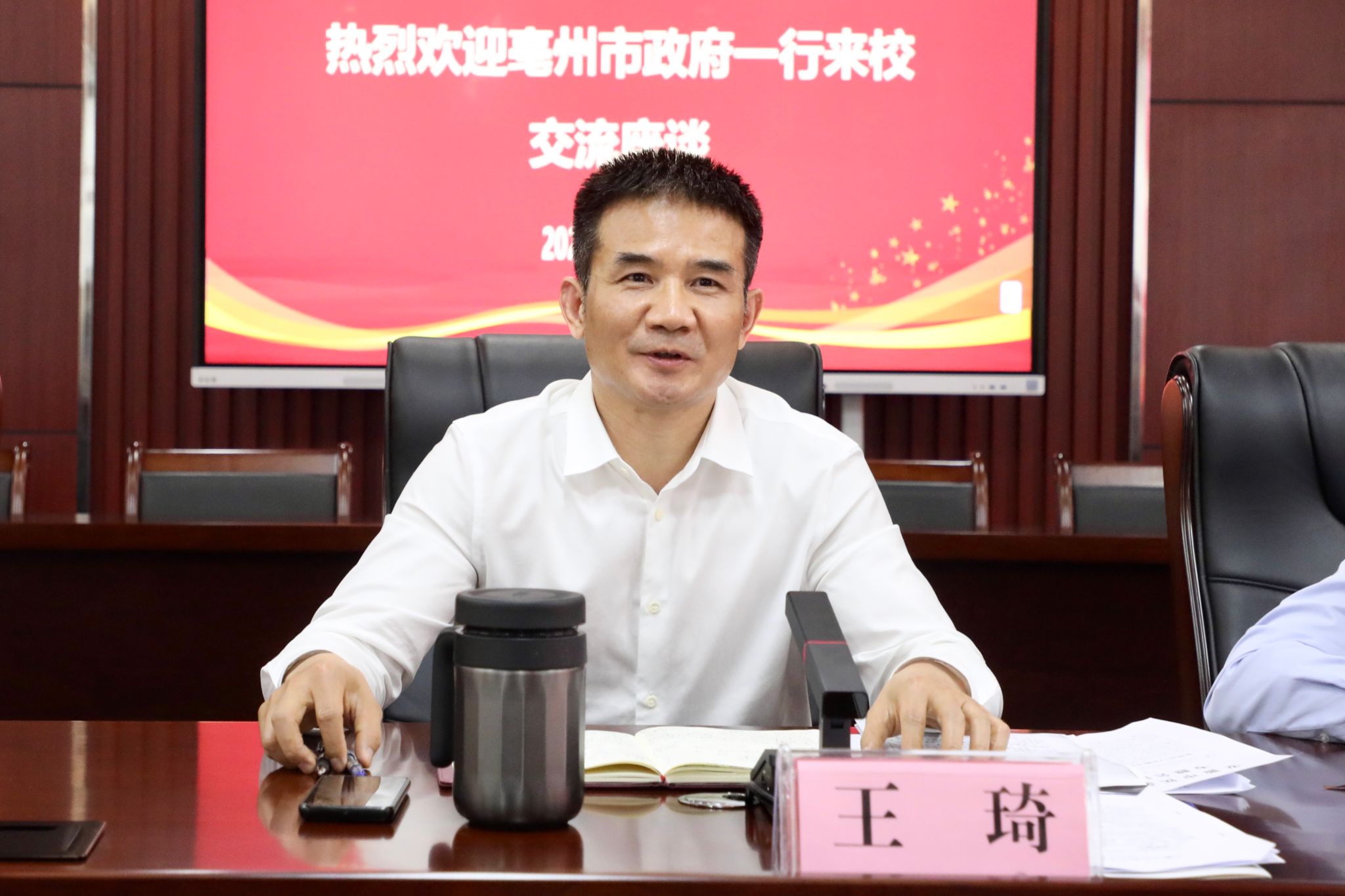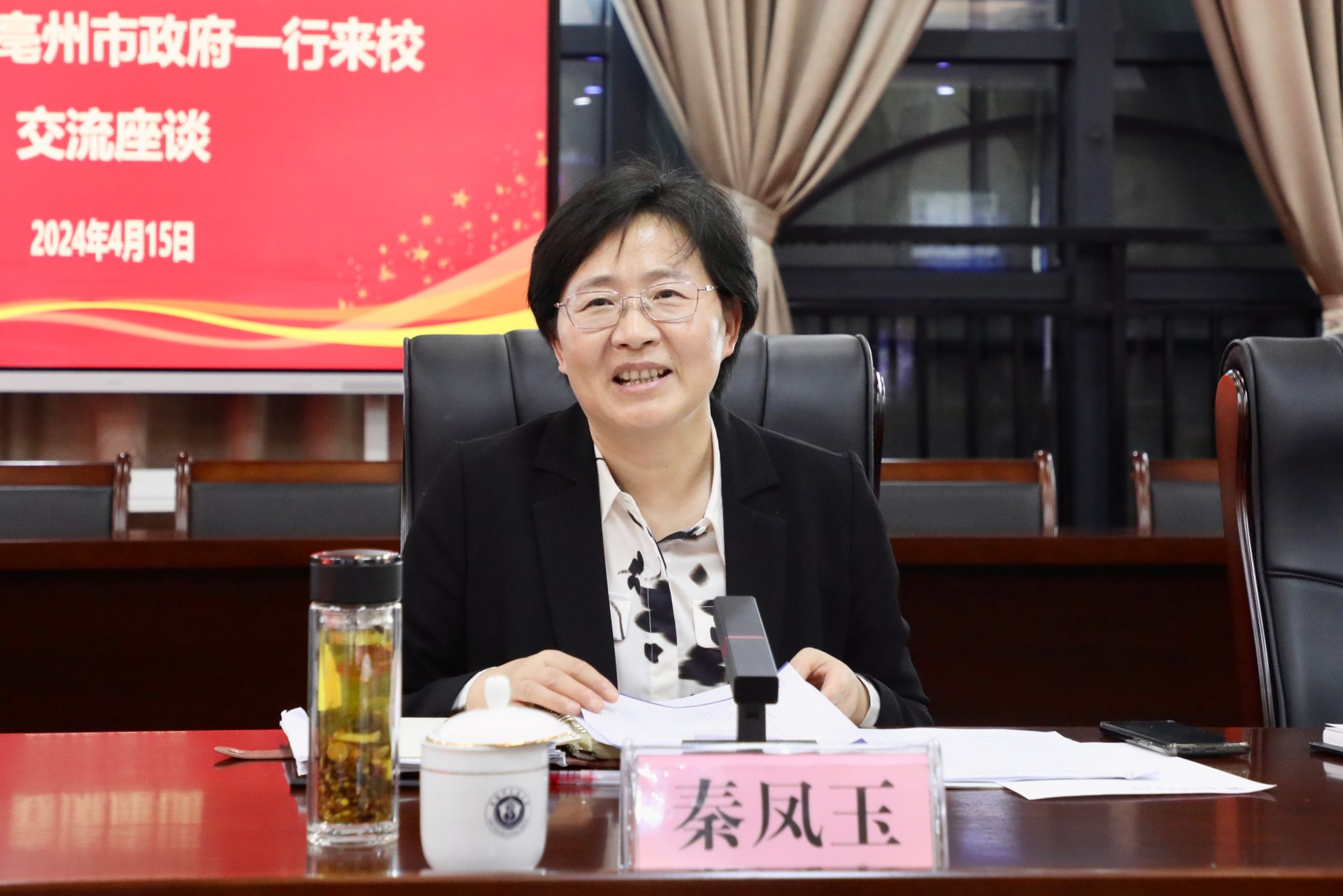 为深入推进中医药传承创新发展,开创校地合作高质量、高能级新局面,4月15日,学校与亳州市政府召开工作交流座谈会。亳州市委副书记、市政府市长秦凤玉,市政府副市长曹振萍,我校党委书记王琦,党委副书记、校长许钒,党委常委、副校长魏骅等出席会议。会议由许钒主持。