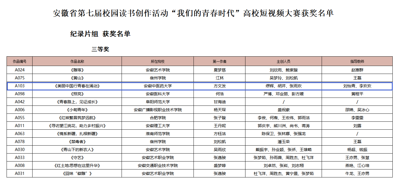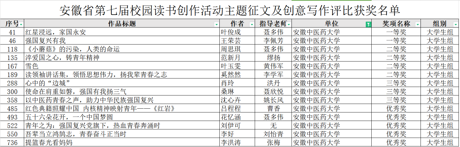 为深入学习贯彻党的二十大精神,深化“全民阅读”、打造“书香安徽”、建设“书香校园”,引导激励全省广大师生爱读书、读好书、善读书,安徽省教育厅、人力资源和社会保障厅、文旅厅、团省委联合举办安徽省第七届校园读书创作活动。我校共报送75件征文作品、7件短视频作品,获得主题征文及创意写作评比一等奖2项、二等奖4项、三等奖3项、优秀奖5项,高校短视频大赛三等奖1项。