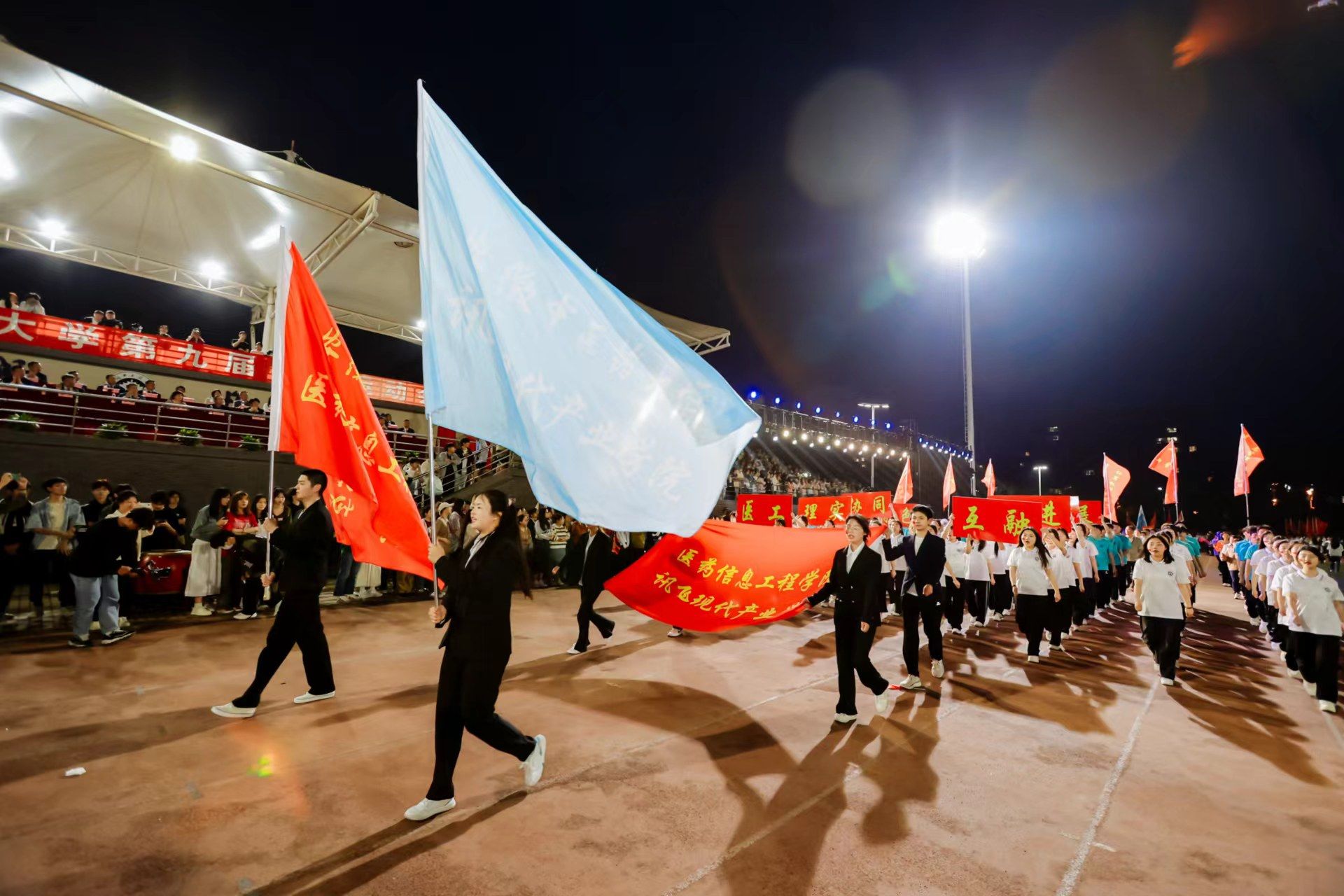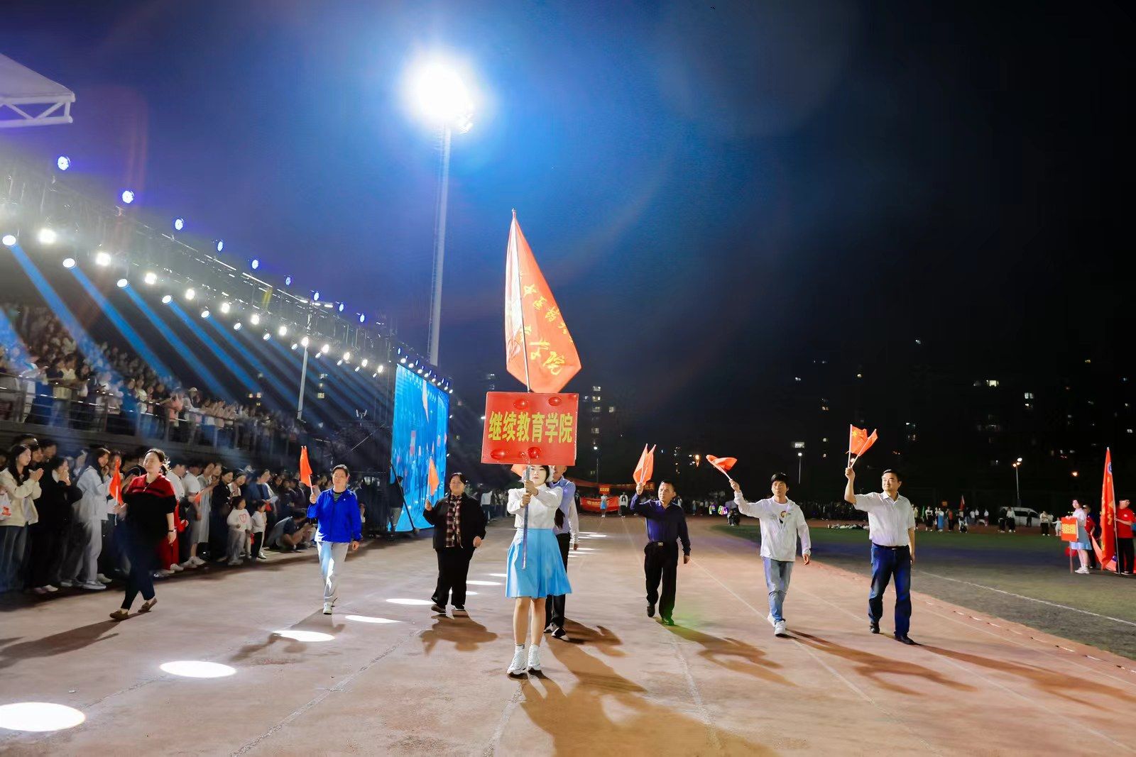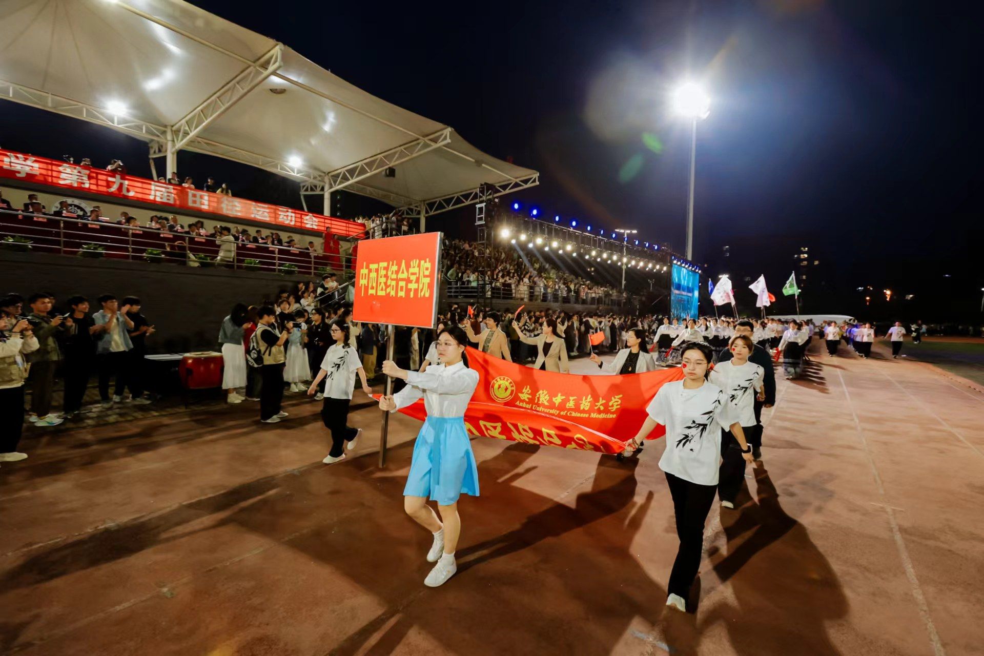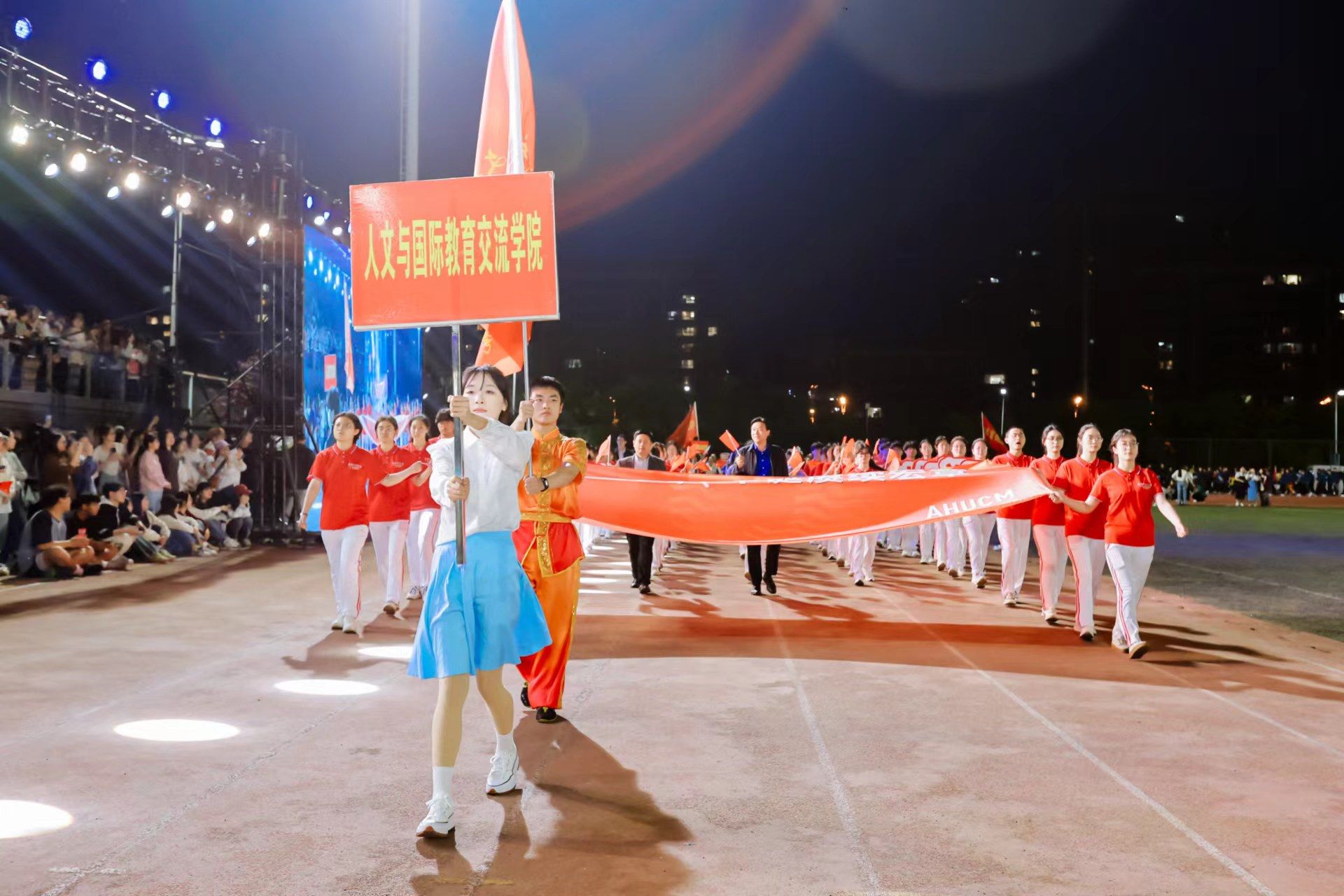 为迎接新中国成立75周年、学校建校65周年,深入实施全民健身国家战略,4月22日晚,我校第九届田径运动会开幕式在少荃湖校区田径运动场隆重举行。学校领导许钒、戴敏、魏骅、石金明,学校党委常委罗绍明、聂久胜、田磊,组委会副主任、委员,各代表队负责人和全体运动员、裁判员参加开幕式。