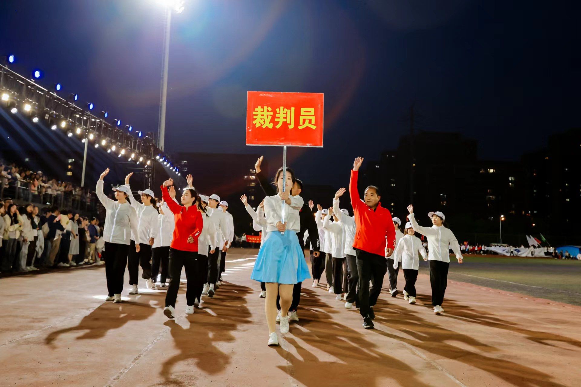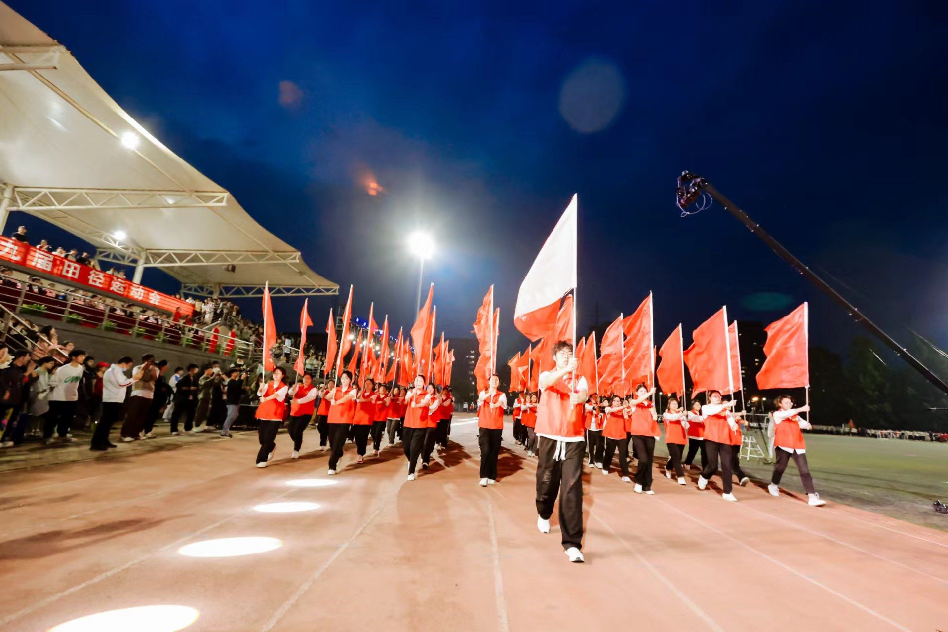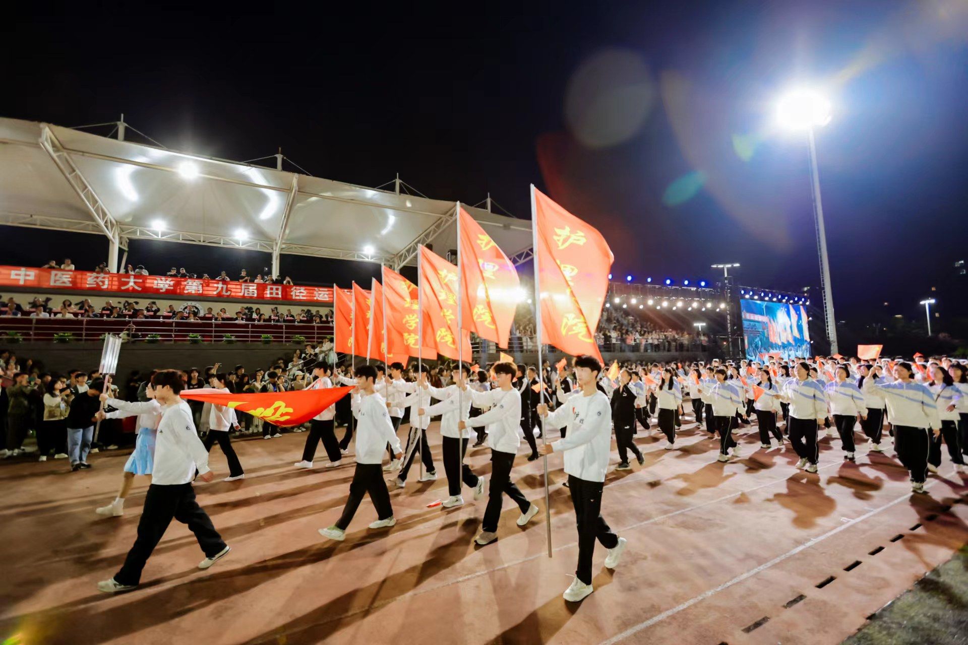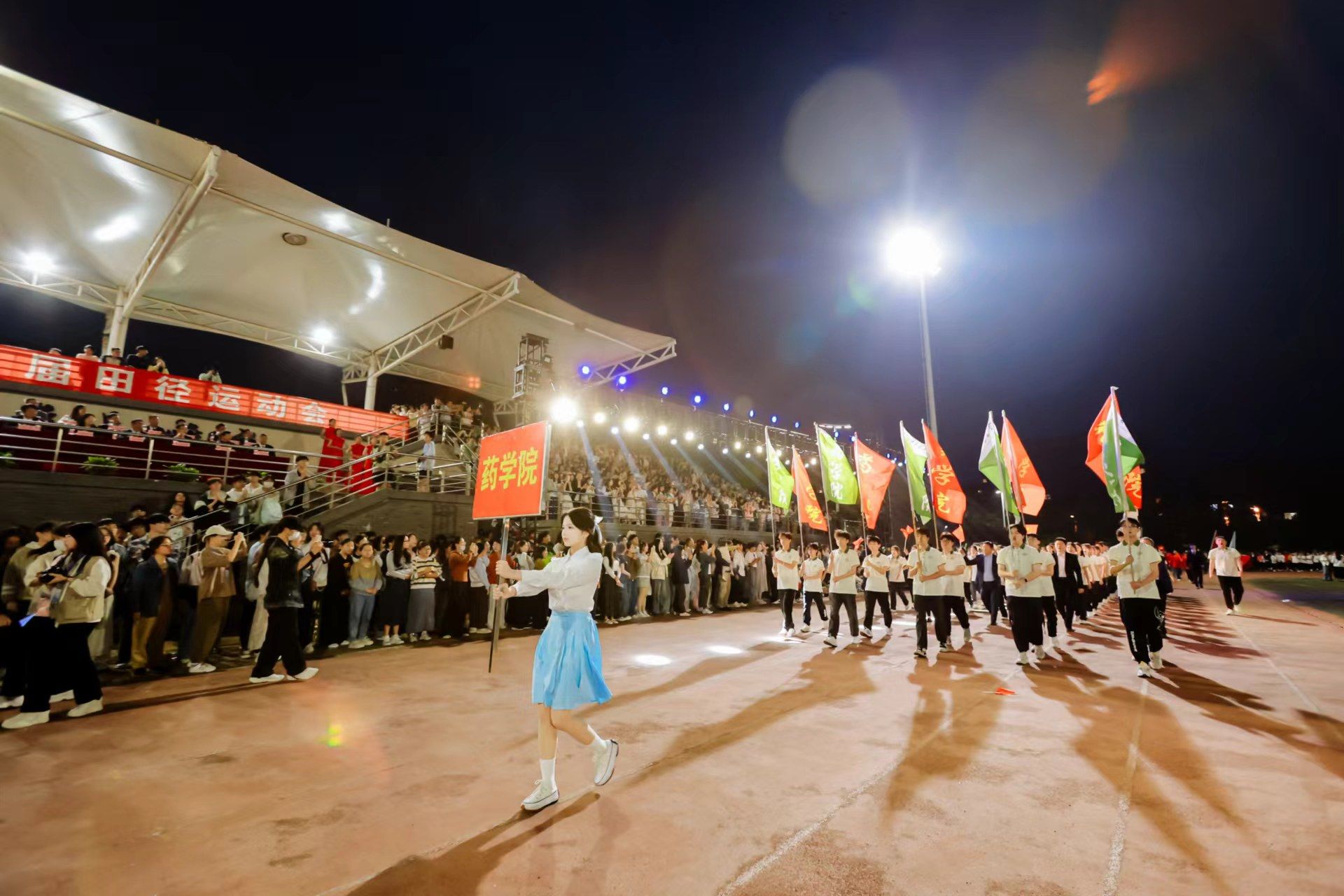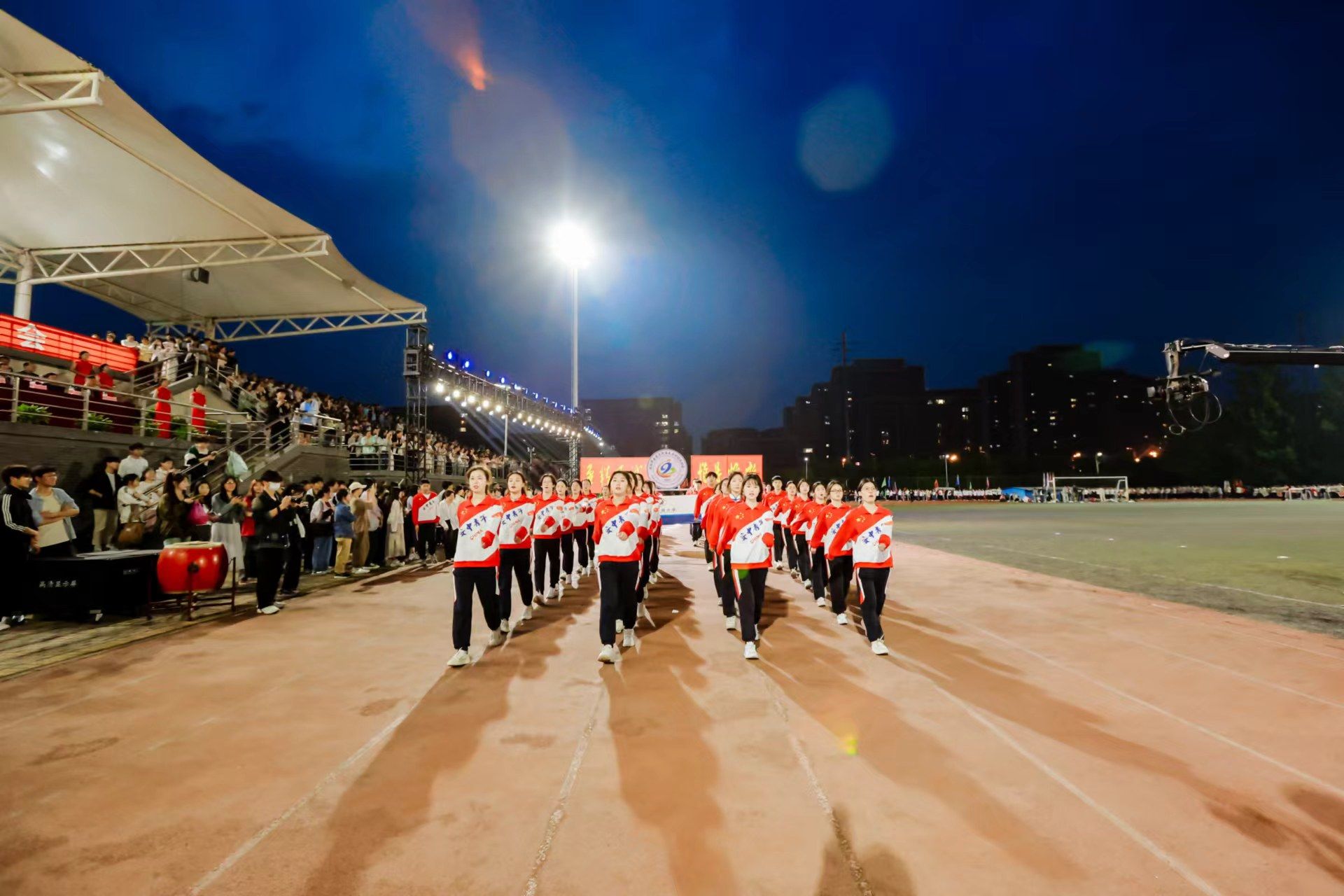 为迎接新中国成立75周年、学校建校65周年,深入实施全民健身国家战略,4月22日晚,我校第九届田径运动会开幕式在少荃湖校区田径运动场隆重举行。学校领导许钒、戴敏、魏骅、石金明,学校党委常委罗绍明、聂久胜、田磊,组委会副主任、委员,各代表队负责人和全体运动员、裁判员参加开幕式。