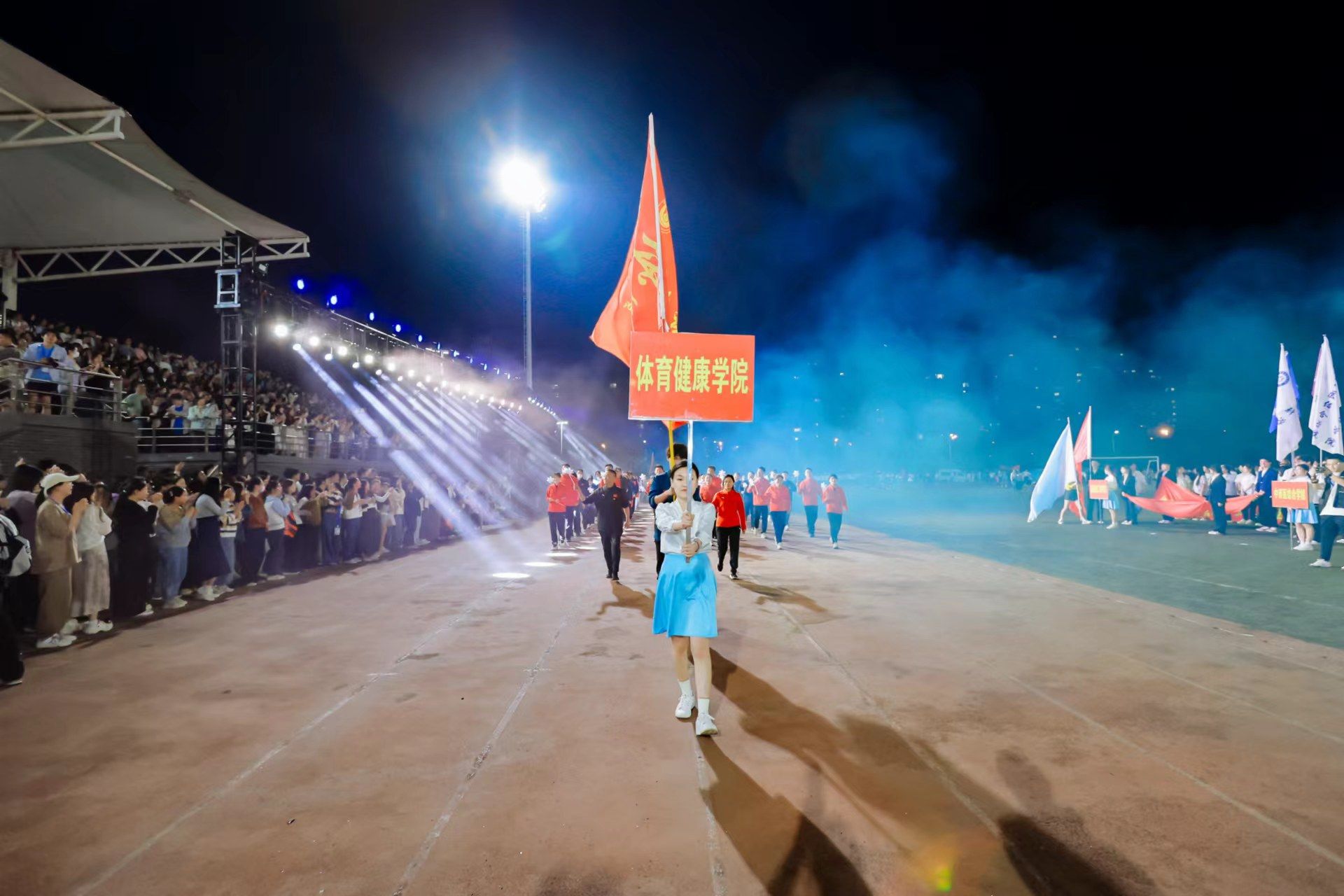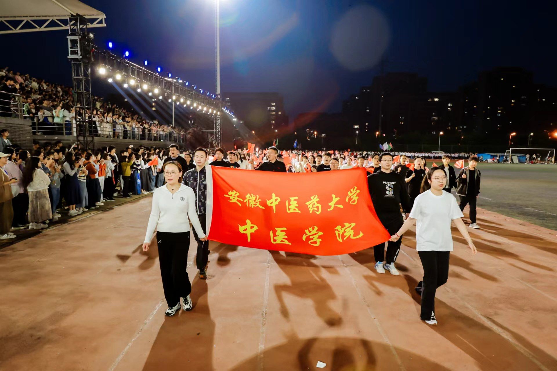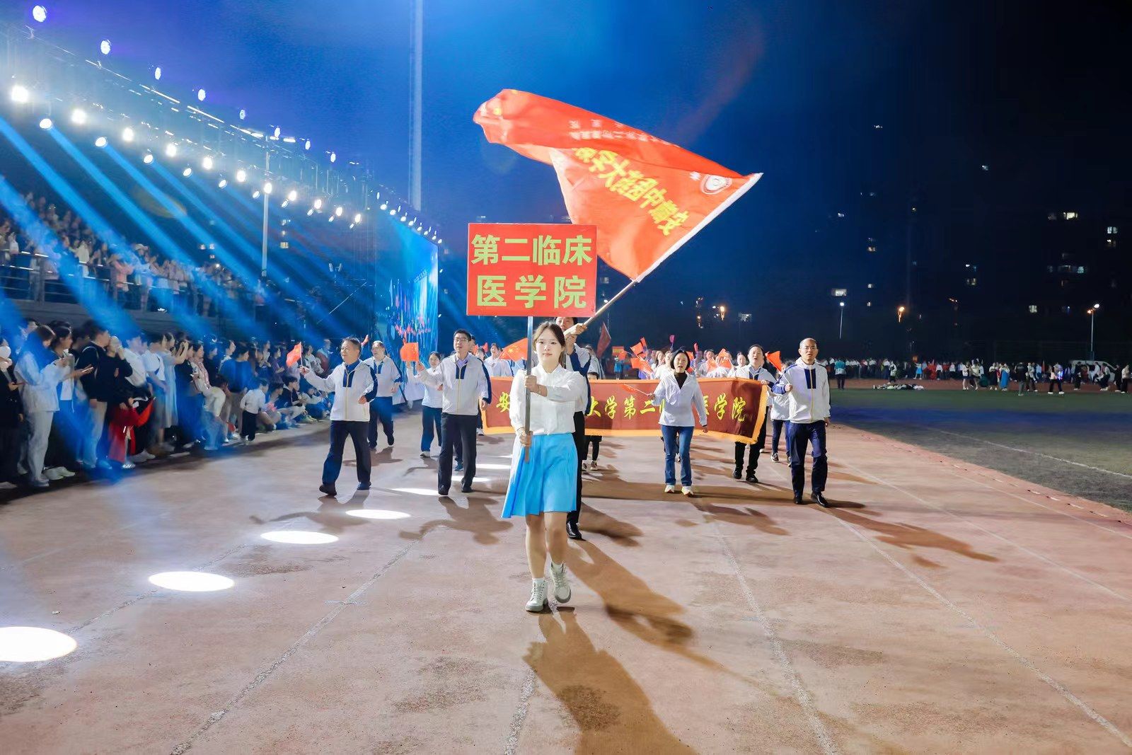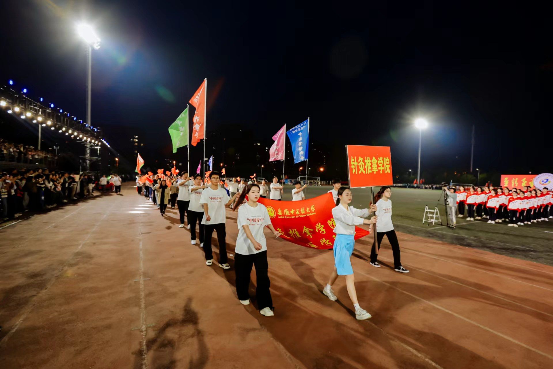 为迎接新中国成立75周年、学校建校65周年,深入实施全民健身国家战略,4月22日晚,我校第九届田径运动会开幕式在少荃湖校区田径运动场隆重举行。学校领导许钒、戴敏、魏骅、石金明,学校党委常委罗绍明、聂久胜、田磊,组委会副主任、委员,各代表队负责人和全体运动员、裁判员参加开幕式。