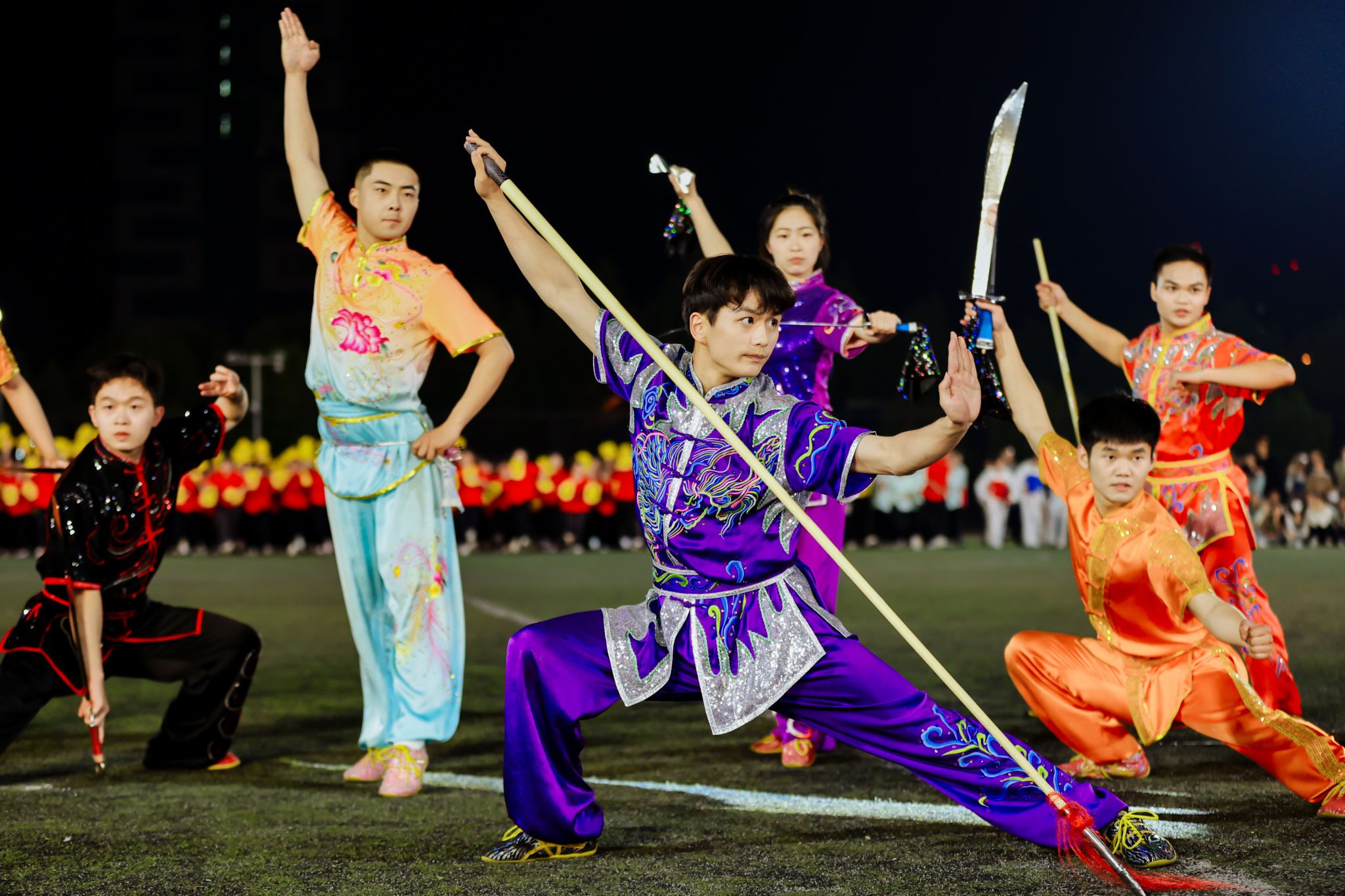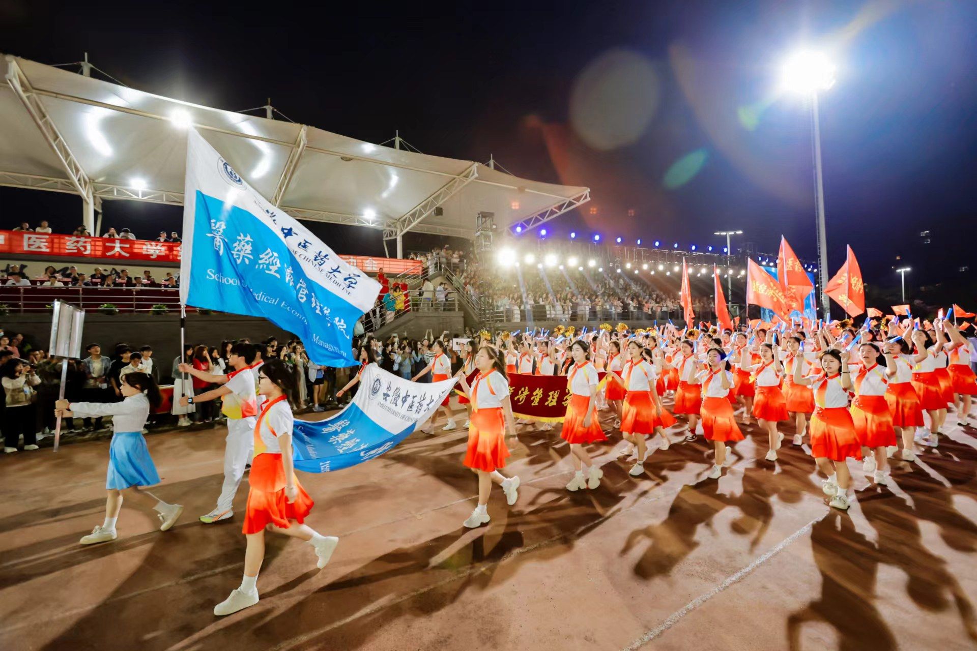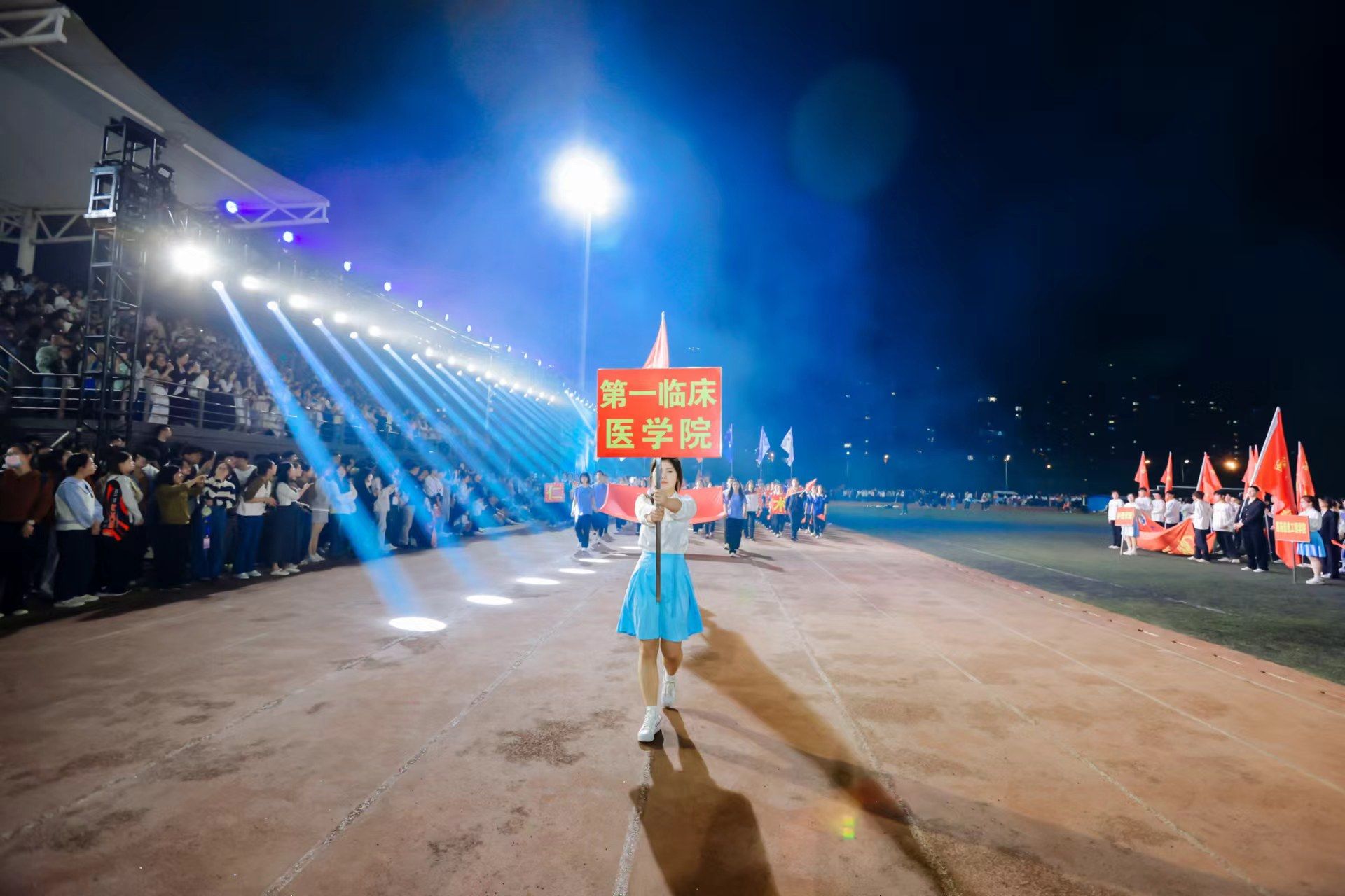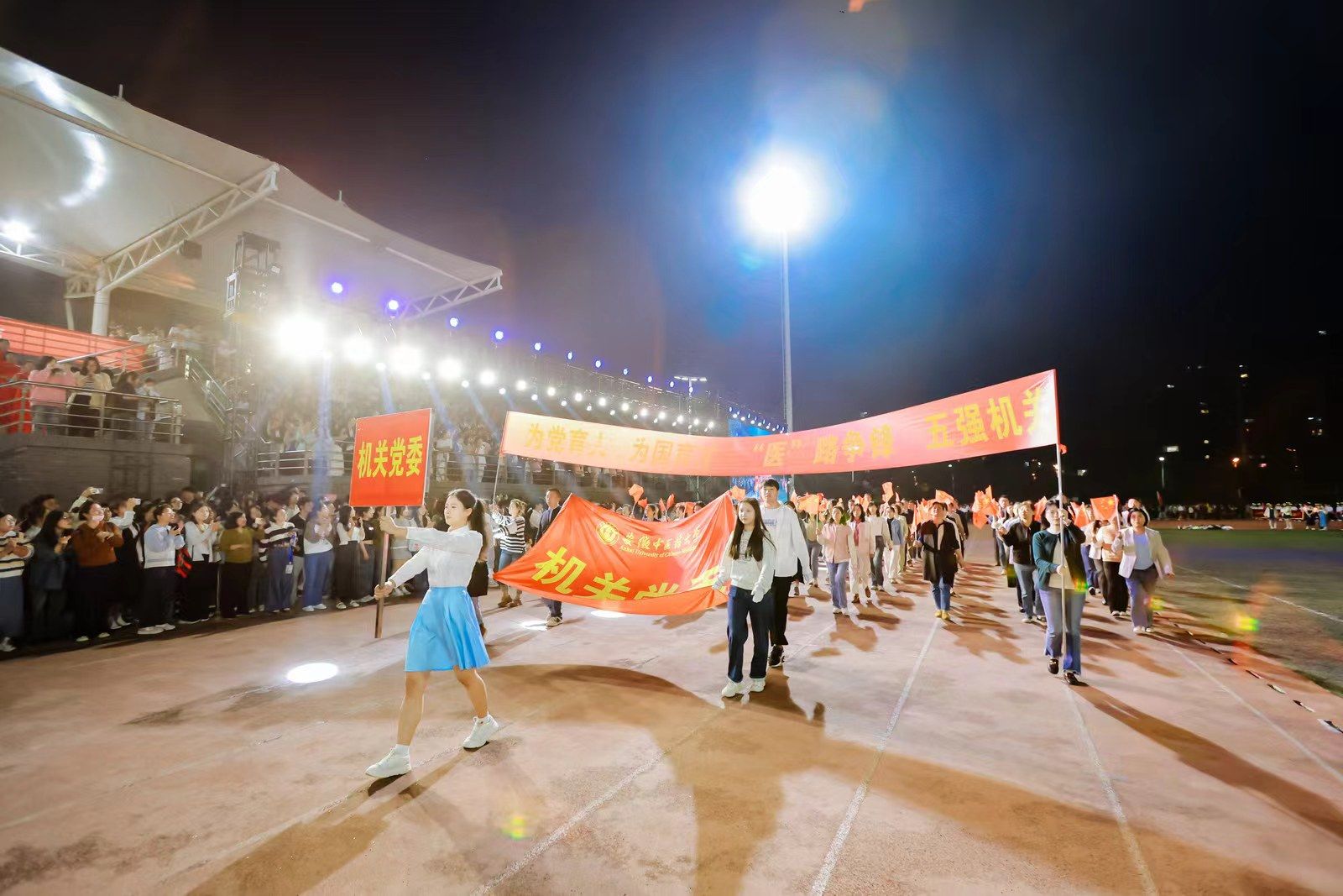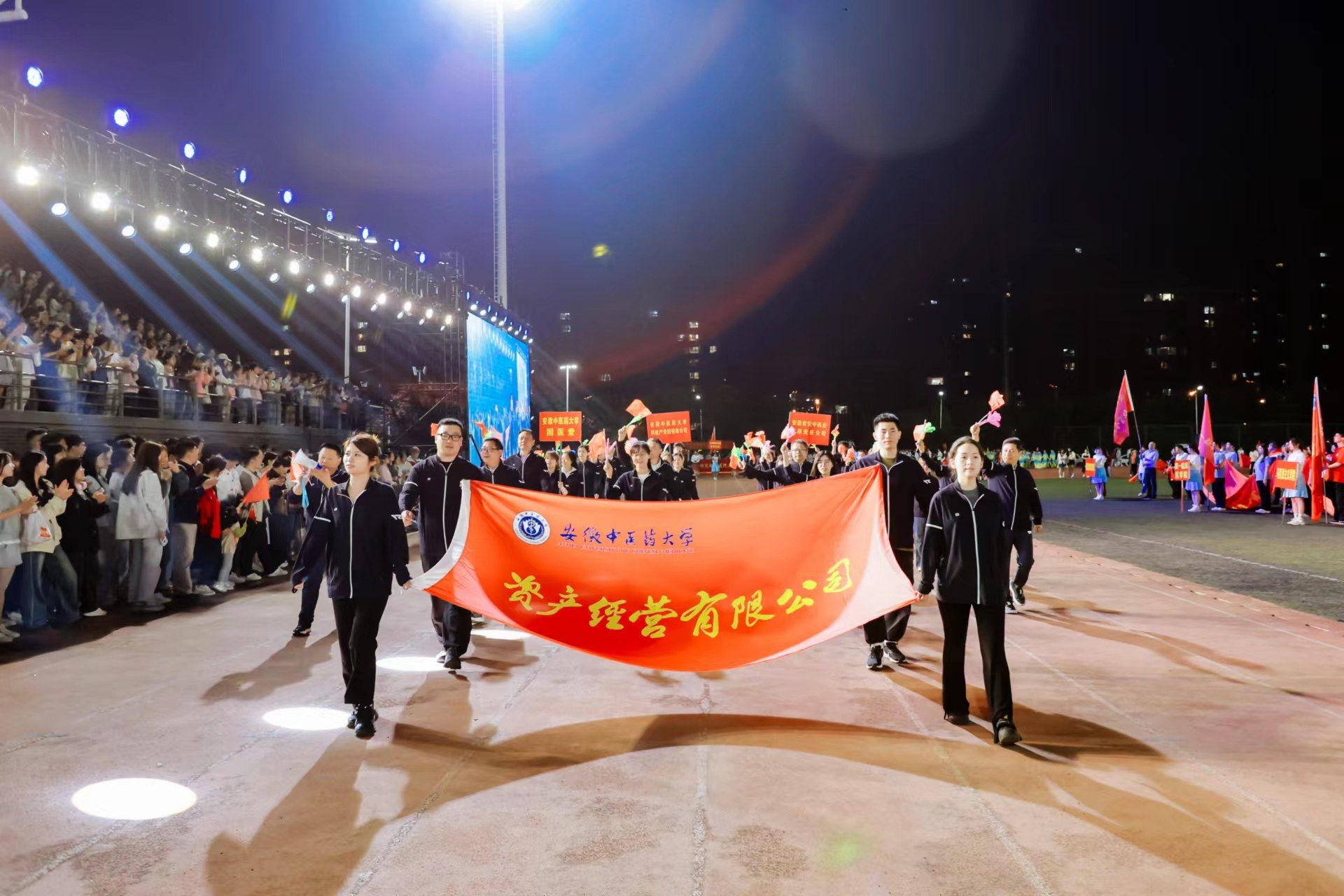 为迎接新中国成立75周年、学校建校65周年,深入实施全民健身国家战略,4月22日晚,我校第九届田径运动会开幕式在少荃湖校区田径运动场隆重举行。学校领导许钒、戴敏、魏骅、石金明,学校党委常委罗绍明、聂久胜、田磊,组委会副主任、委员,各代表队负责人和全体运动员、裁判员参加开幕式。