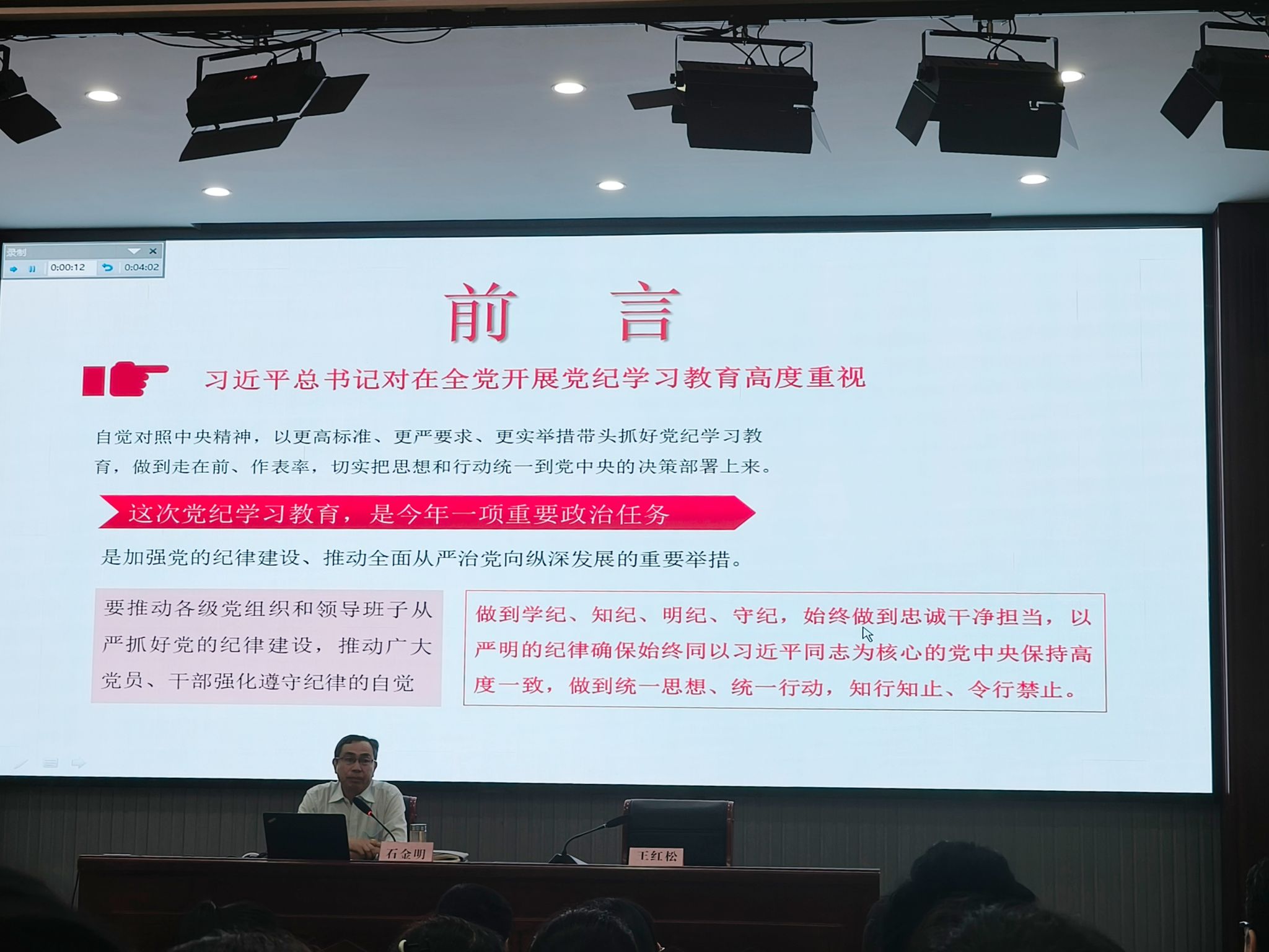 石金明以“《中国共产党纪律处分条例》(2023年版)解读”为题,深入分析了《中国共产党纪律处分条例》(简称《条例》)修订的重要意义和主要特征,详细解读了《条例》修订的主要内容及学习要求,并结合典型案例进行警示。石金明就本次党纪学习教育对全体党员同志提出三点要求,一是要树牢纪律观念,提高学习《条例》的自觉性和主动性;二是要增强监督意识,提高贯彻《条例》的执行力;三是要弘扬严实作风,以实际行动贯彻落实《条例》精神。
