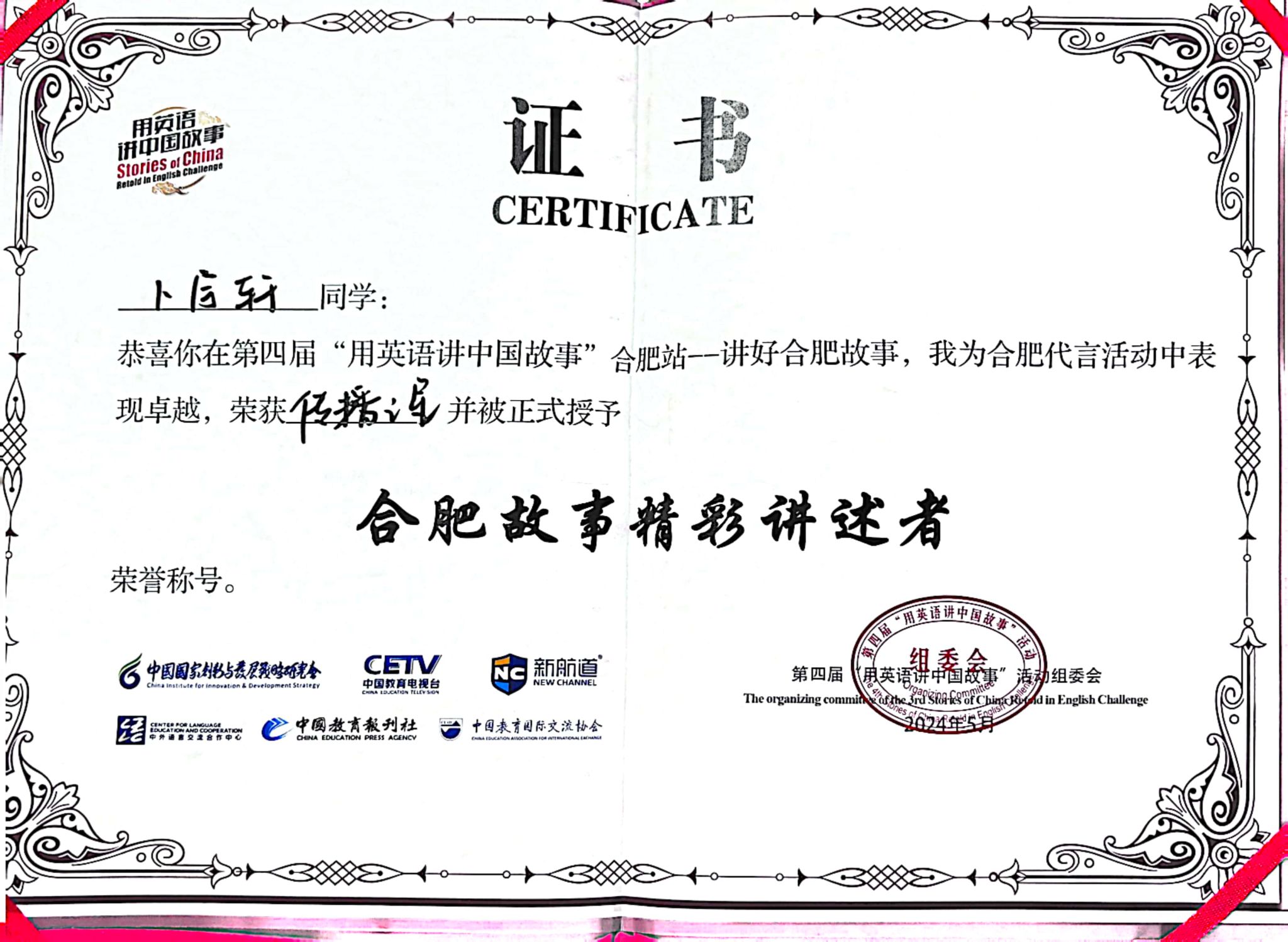 来自2021级中西医结合专业的卜宇轩同学在英语演讲环节讲述了合肥中医药发展的历史溯源及当前的发展现状,结合个人学习成长经历,讲述了青年一代如何将个人发展与中医药事业发展紧密相连,以中医药文化为载体,推动中医药传承创新发展,坚定文化自信;在才艺展示环节,她展示了传统健身功法八段锦,并用英语阐释了其祛病健身之功效,充分展示了中医药文化的风采。来自2021级中药学专业的选手沈骏娴讲述了合肥爱国将领的传奇经历,在才艺展示环节以优美的古典舞表达了对英雄人物的深厚情感。两位选手均获“传播之星”称号,展现了我校学子深厚的文化底蕴和出色的英语表达能力。