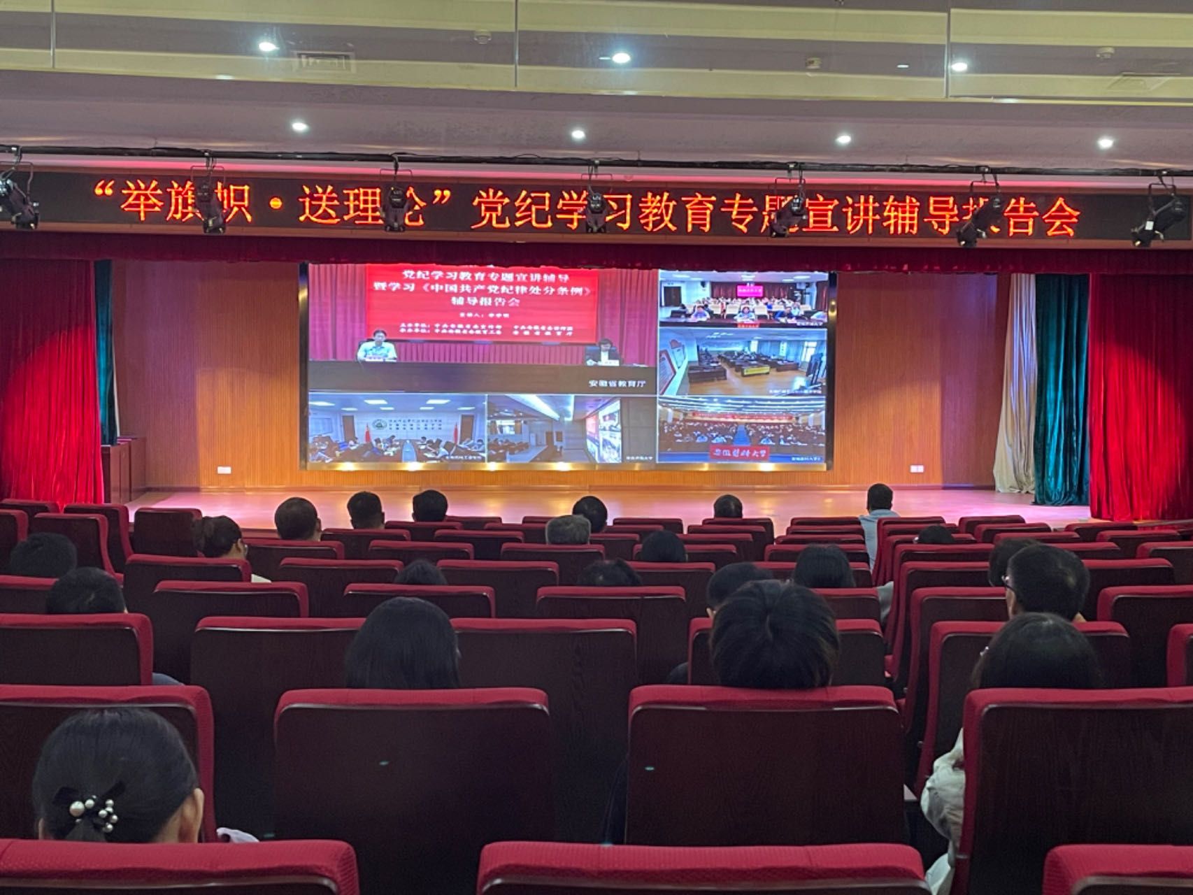 报告会以视频会议方式召开,在委厅机关设主会场,在我校少荃湖校区图书馆报告厅设立分会场。校领导班子成员,各职能部门、院系副处级以上干部,部分教师、学生党员代表共计120余人参加会议。