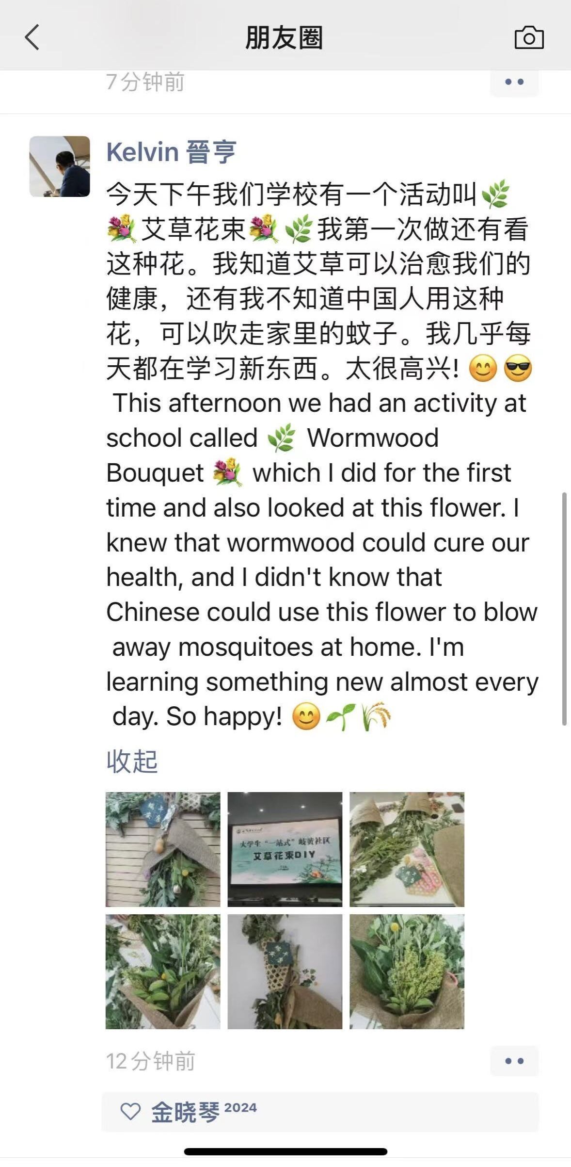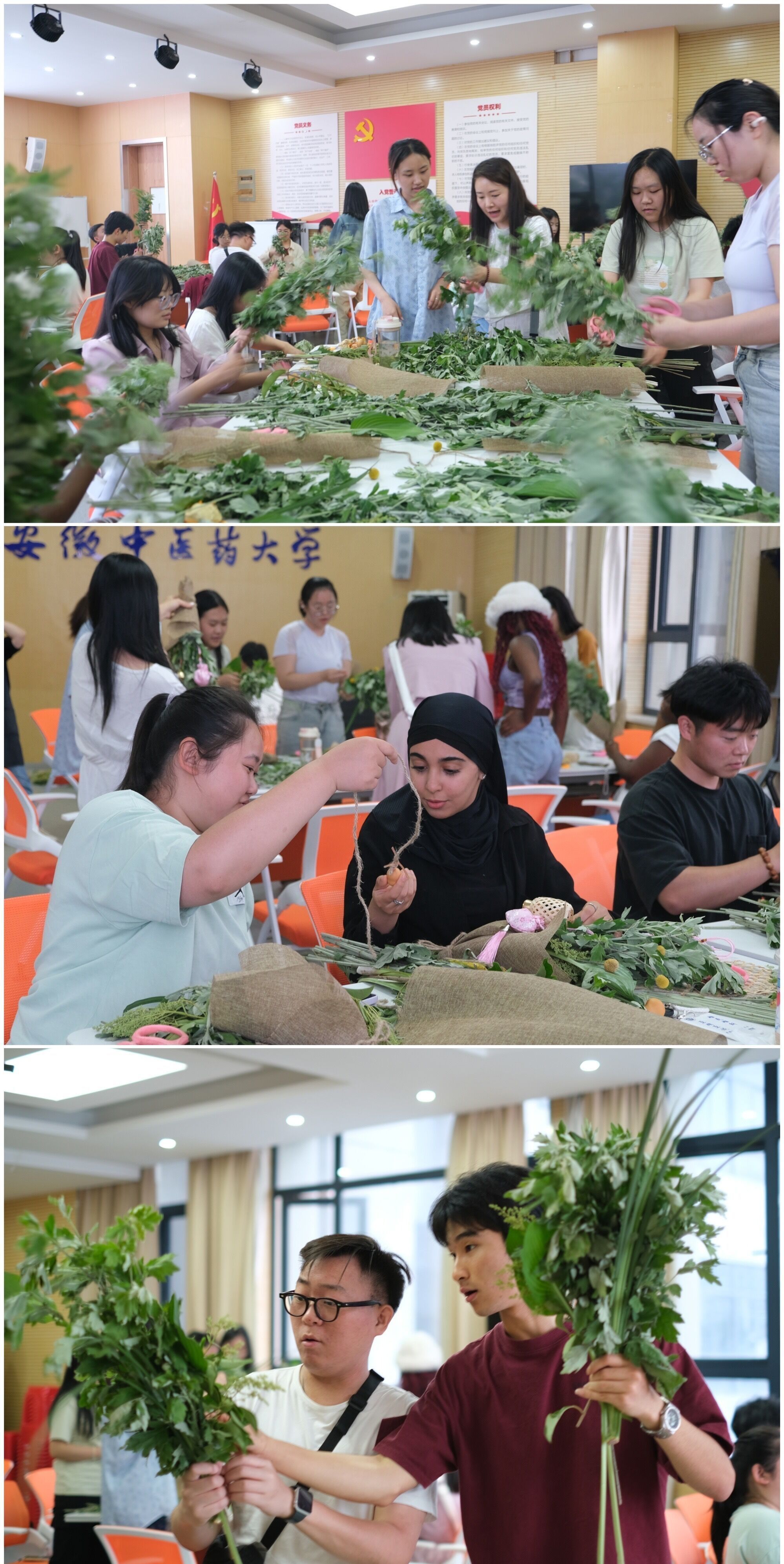“艾草花束DIY”活动在惟是楼205活动室开展,活动吸引到在校生与留学生一同参加。在花艺老师的指导下,大家积极发挥动手能力,以艾草和菖蒲打底,修剪、整形,再系上精致的香囊、葫芦、铃铛、“端午安康”卡片等挂饰,让中草药材摇身变成了精美花束。弥漫着艾草清香的活动室欢声笑语不断,同学们纷纷表示非常喜爱这样的文化体验活动。留学生晋亨说:“我第一次看到艾草,制作了艾草花束,原来艾草还可以驱走蚊虫。我几乎每天都在学习新东西,太高兴了!”