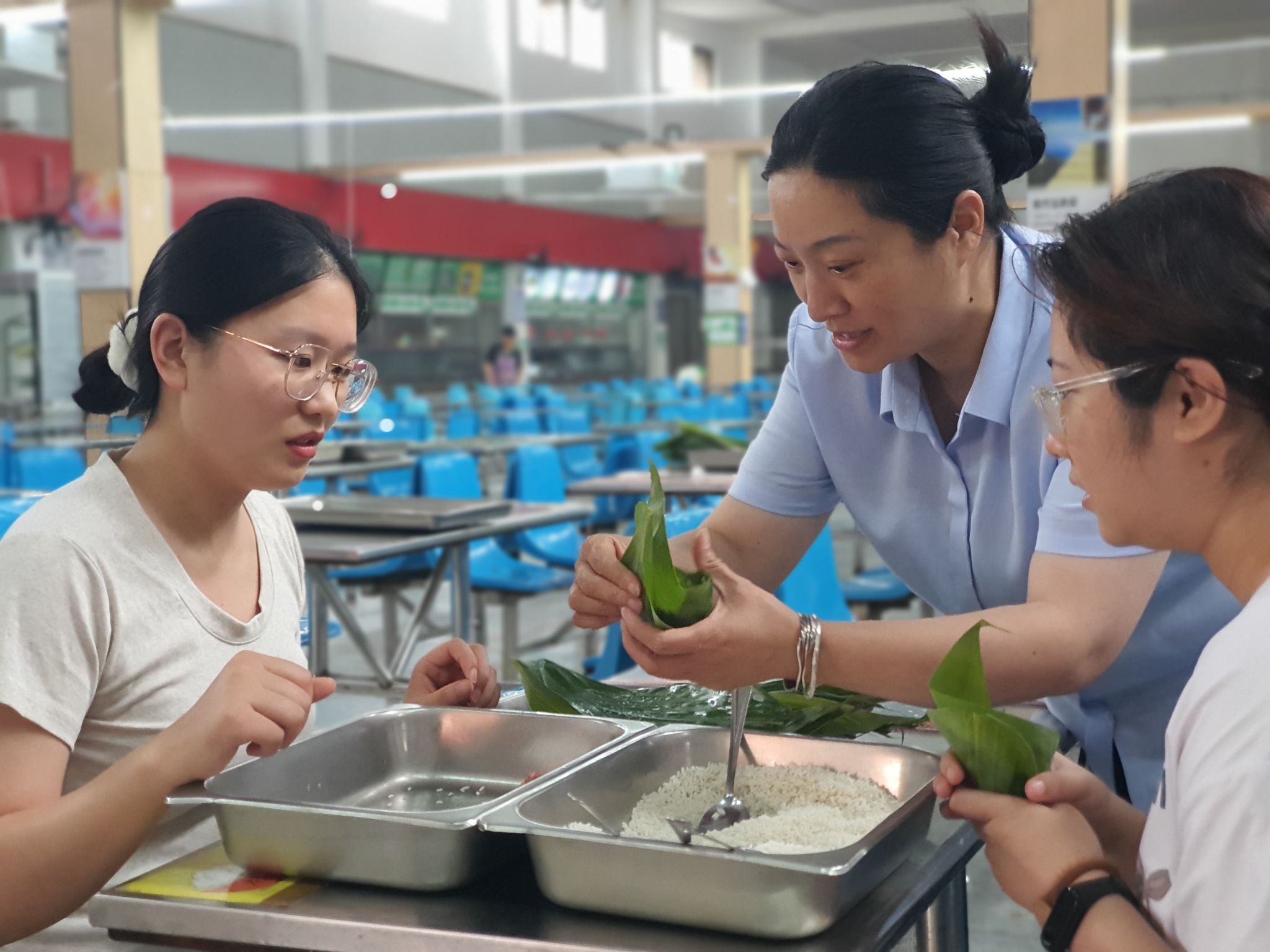 在学校少荃湖和梅山路校区餐厅,学生处联合总务处,开展“粽香端午,浓情飘香”包棕子活动。同学们在餐厅阿姨的现场指导下学习包粽子。蜜枣、花生、红豆等各式馅料,拆叶、盛料、压实、裹叶、封口、扎绳,在一双双巧手下,一颗颗怀着对家人、亲友、老师节日祝福的美味粽子烘托出节日的欢乐氛围。
