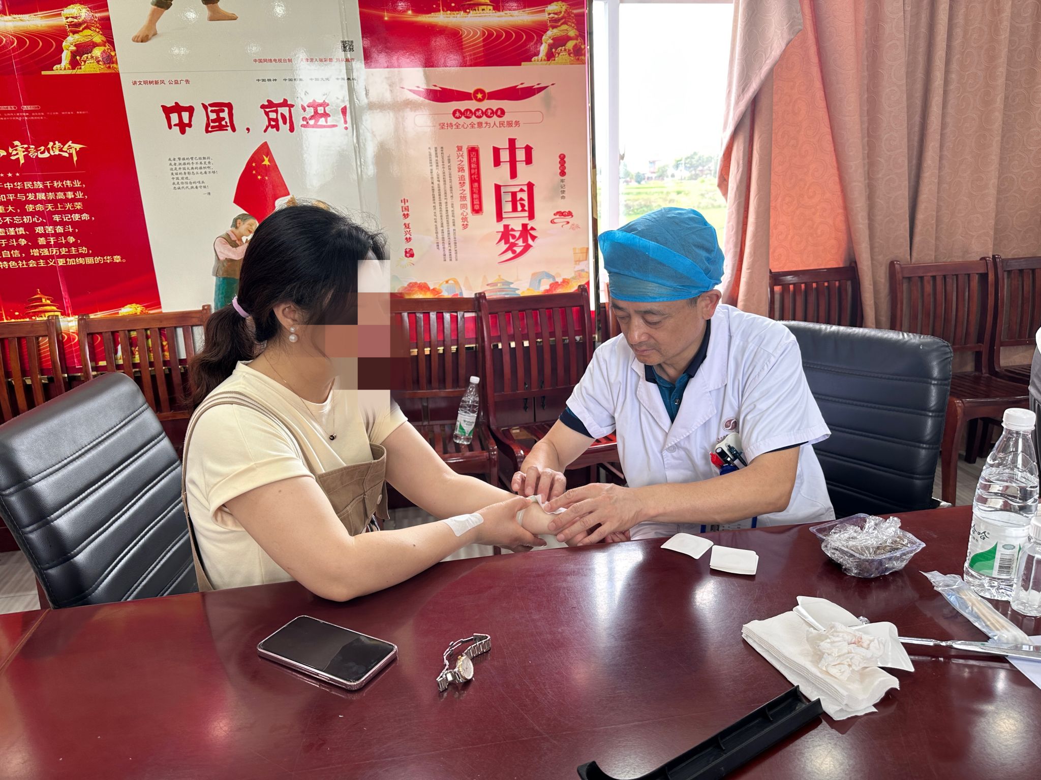 活动结束已过12点,医护专家们陆续进入饭店用餐。正在这时,一位女士骑车电动车追了过来,急切的问道:“有没有骨科医生,还能看病吗?我的颈椎一直不舒服,能不能找个医生帮我看看?”曙光安徽医院骨伤一科负责人杨光亲切地上前了解情况,并为李女士做了手法复位。回程的班车即将开动,杨光还不忘留下联系方式,方便他们再咨询。