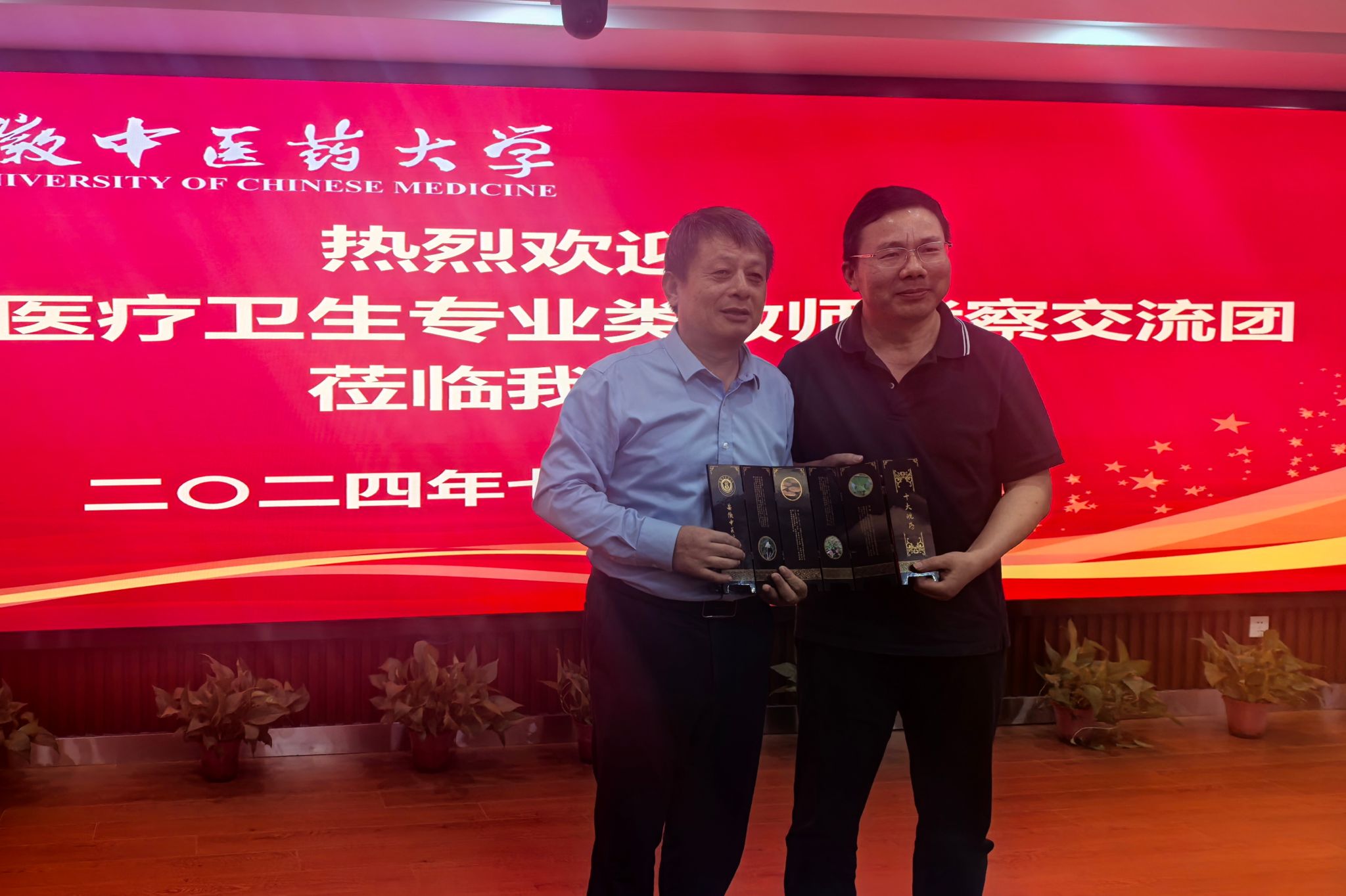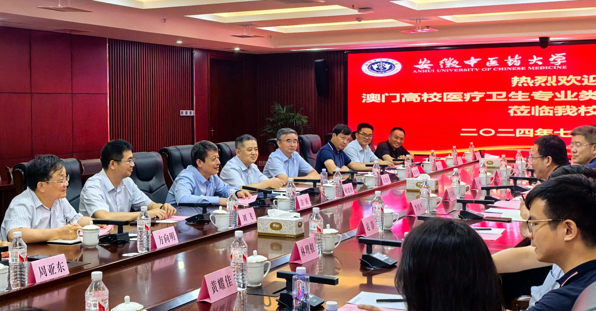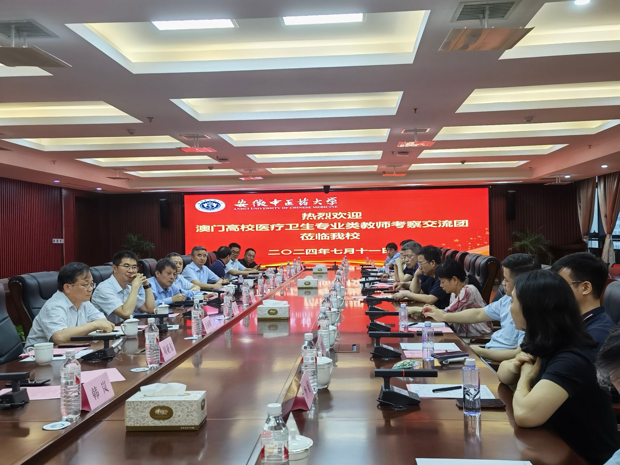 参观结束后,双方进一步交流座谈,安徽省教育厅外事处处长姚德勇、副处长刘飞,学校党委副书记、校长许钒,科技处处长吴德玲,中医学院院长方向明,针灸推拿学院副院长刘自兵,药学院副院长韩 岚,护理学院院长颜贵明,人文与国际教育交流学院院长周亚东及体育健康学院党总支书记夏宏武参加了座谈交流。