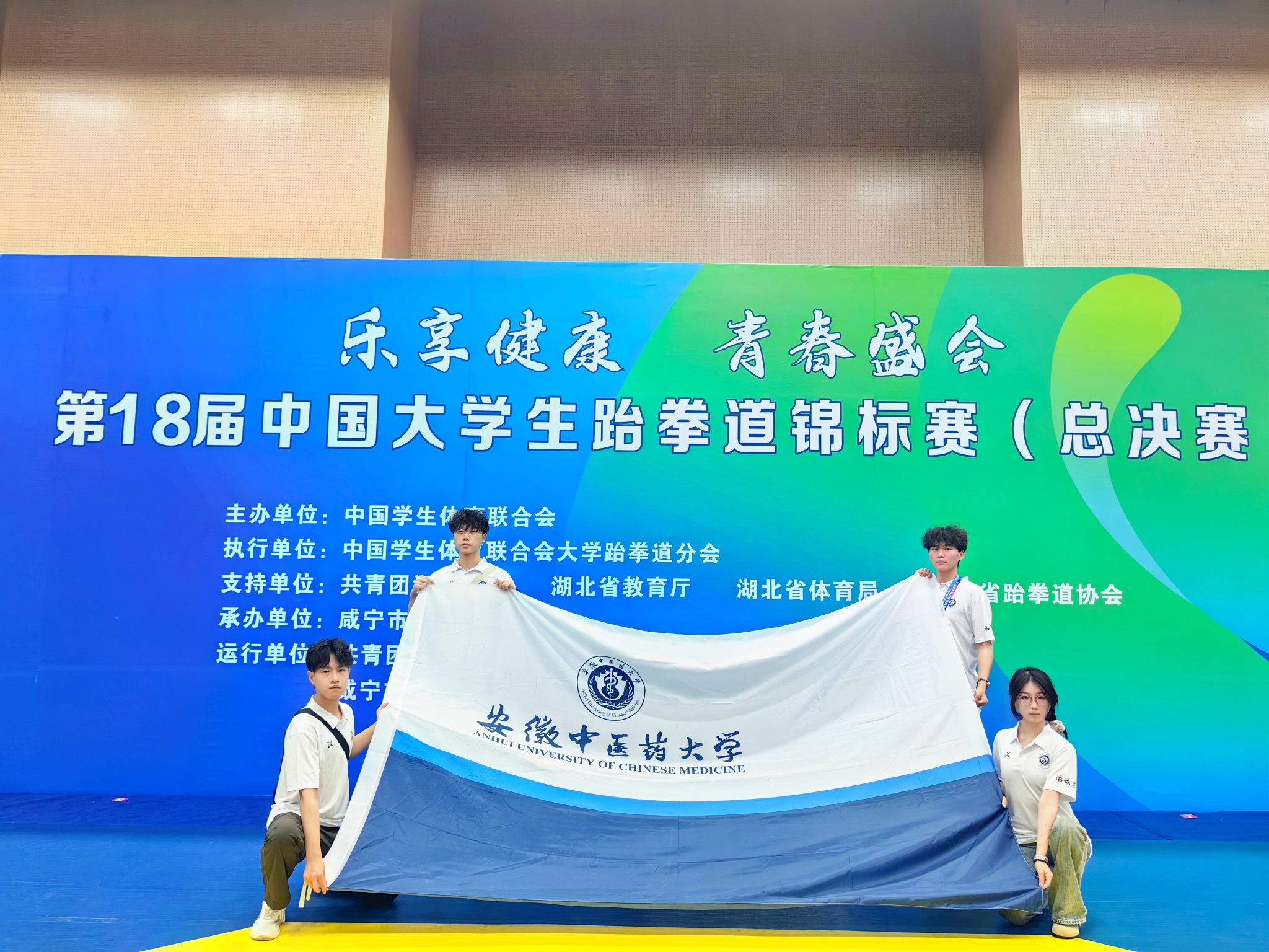 百校千人总决赛,青春绽放更精彩!7月20日至26日,第18届中国大学生跆拳道锦标赛(总决赛)在湖北省咸宁市举行。我校运动员针灸推拿学院华心远获男子甲组品势太极七章冠军;华心远、第一临床医学院朱韵凯、医药经济管理学院李耀祖获男子甲组品势三人团体太极八章亚军;中西医临床医学院潘依慧获女子甲组品势太白季军。