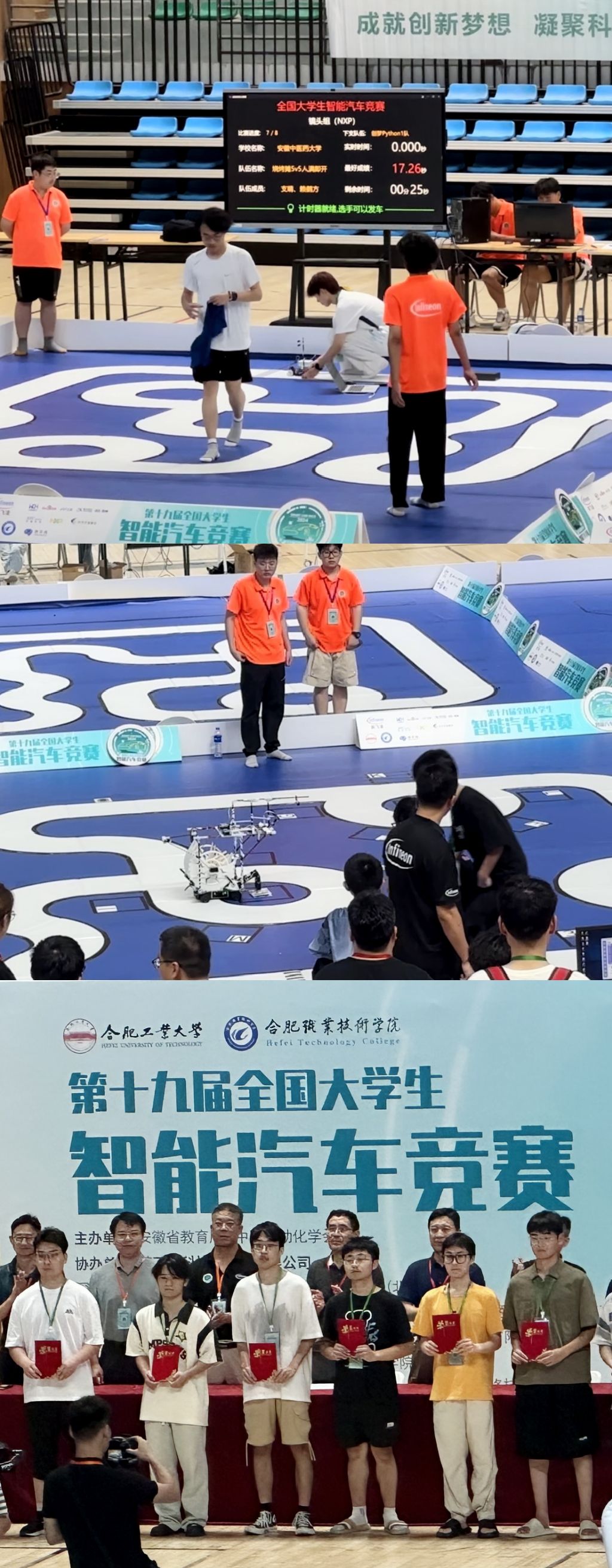 7月22日至23日,第十九届全国大学生智能汽车安徽赛区竞赛在合肥职业技术学院汇心湖校区举办,全省50多所高校共600多支队伍参加了此项赛事。我校共有16支参赛队伍参加12项比赛,其中8支队伍分别在越野组、独轮组、气垫组、镜头NXP组、基础摄像头组荣获安徽省一等奖,4支队伍荣获安徽省二等奖,1支队伍荣获安徽省三等奖。