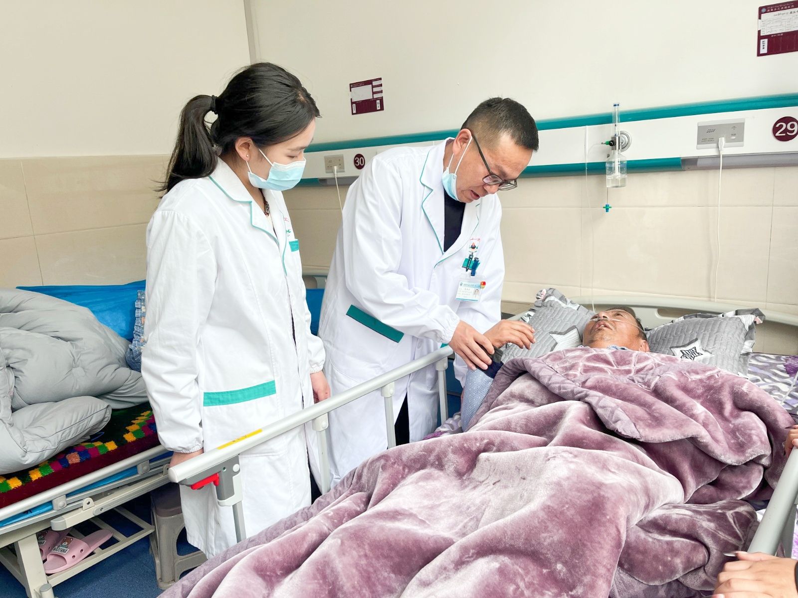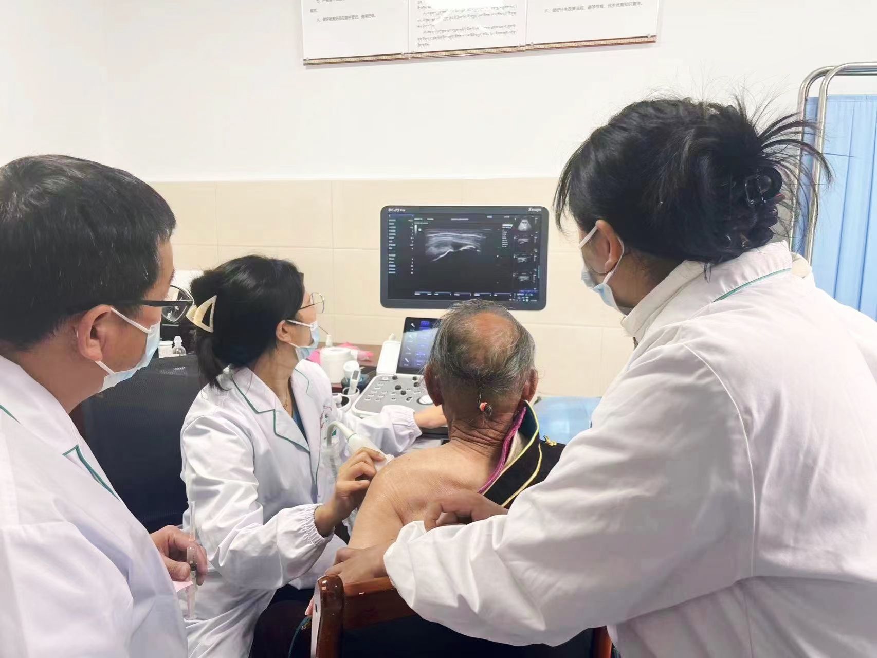 陈瑞全、吴晓倩不仅仅注重技术的传授,更重视临床思维的构建和医德的传递,他们以身作则,用自己的行动诠释了援藏医生的责任意识,授人以鱼不如授人以渔,“输血”式的援助虽能解一时之急,但“造血”功能的培育是长远之计。入驻洛扎县藏医院后,当地医院举行了援藏专家见面会与“师带徒”拜师仪式。自带徒以来,两位队员通过每周的业务讲座、门诊带教和教学查房等方式,积极与藏医同行们沟通交流,为当地医疗力量积极“造血”,每周轮流开展业务讲座,围绕藏区群众常见病多发病,如急慢性疼痛、心脑血管病等的系统总结。教学相长,通过共同学习和经验交流,激发了藏医同行的学习热情,拓展他们的思路和视野。在资源有限的环境下,门诊带教和教学查房成为了帮助藏区医生拓宽诊断思路、提升临床技能、连接临床理论和实践的关键环节。藏医院检验项目受限,缺少MRI、CTA等检查设备,陈瑞全、吴晓倩充分利用现有条件,围绕问诊、查体、读片和诊断性治疗,积极开展教学活动。陈瑞全从患者主诉出发,确认病史及发展细节,结合体格检查和影像读片,边看诊边示范教学,藏医同行们从中多受启发。吴晓倩利用自己所学,应临床需要,带领藏医院同行开展肌骨神经超声,填补了该地区这一技术的空白。两位医生结合当地医院情况,积极开展多学科合作的新型医疗项目,如肌骨超声在关节疼痛中的应用、超声引导下疼痛注射、脑血管病的早期康复、神经源性膀胱的评定和康复等。