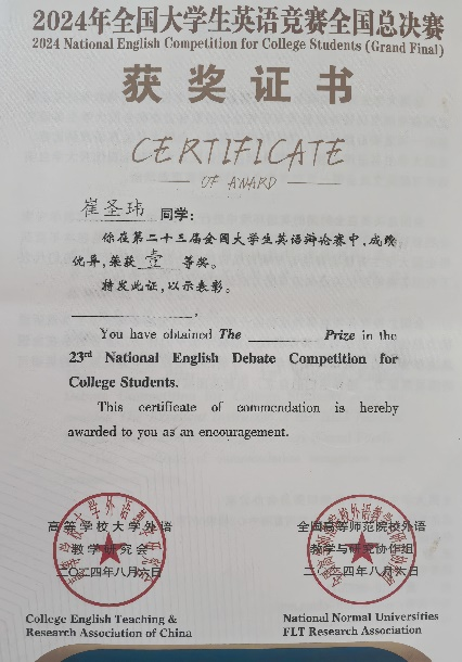 2024年全国大学生英语竞赛(NECCS)全国总决赛于8月2日至6日在广西桂林圆满落幕。经过激烈的预赛和决赛比拼,我校第一临床医学院2022级研究生崔圣玮同学在全国总决赛中表现出色,荣获英语辩论赛全国一等奖、英语演讲比赛全国二等奖和英语风采大赛全国三等奖,并获得“优秀参赛选手”和“优秀主持人”称号。指导教师朱家胜荣获国赛英语辩论赛、英语演讲赛和英语风采大赛“优秀指导教师”称号。