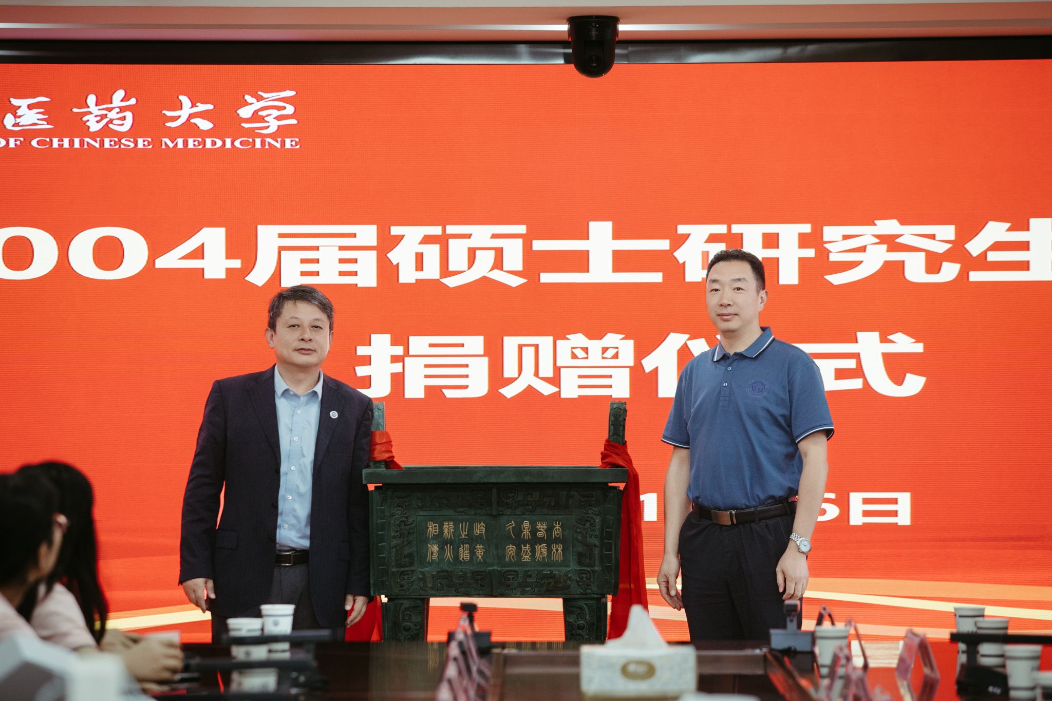 校友王正代表全体同学发言,他首先感谢学校的培养,回忆了在校学习、生活的情景,畅谈毕业后工作情况,并向学校捐赠青铜鼎。青铜鼎上篆刻着“杏林春暖 鼎盛久安 岐黄之道 薪火相传”,代表了2004届研究生全体同学对母校在中医药传承和人才培养方面取得更大成就的美好祝愿。