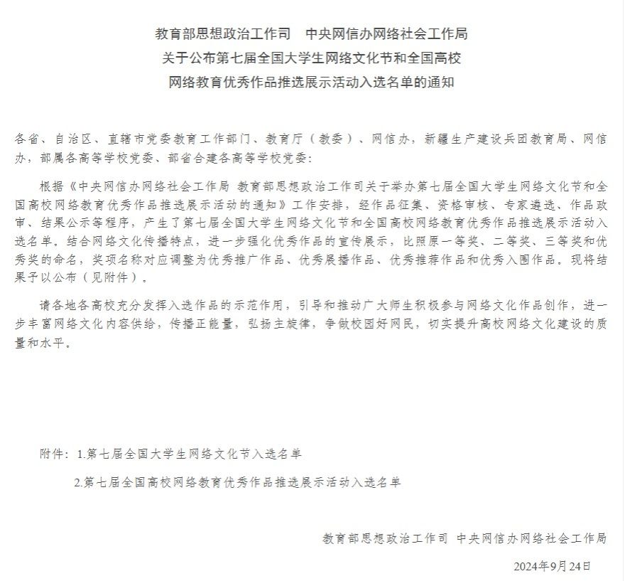 全国大学生网络文化节和全国高校网络教育优秀作品推选展示活动由教育部思想政治工作司、中央网信办网络社会工作局主办,是全国高校网络思政领域级别最高、覆盖面最广的竞赛之一,也是展示全国高校网络思想政治教育典型成效的重要平台。本次比赛以“争做校园好网民,汇聚网络正能量,挺膺担当建新功”为主题,通过省级教育工作部门推荐、教育部直属高校及部省合建高校推荐、个人(团队)自荐三种渠道,两项活动共征集到来自31个省(区、市)和新疆生产建设兵团的50771件作品。结合网络文化传播特点,进一步强化优秀作品的宣传展示,比照原一等奖、二等奖、三等奖和优秀奖的命名,奖项名称对应调整为优秀推广作品、优秀展播作品、优秀推荐作品和优秀入围作品。其中全国高校网络教育优秀作品微课类别共有110项作品入选,获评优秀推广作品10项、优秀展播作品20项、优秀推荐作品30项、优秀入围作品50项。