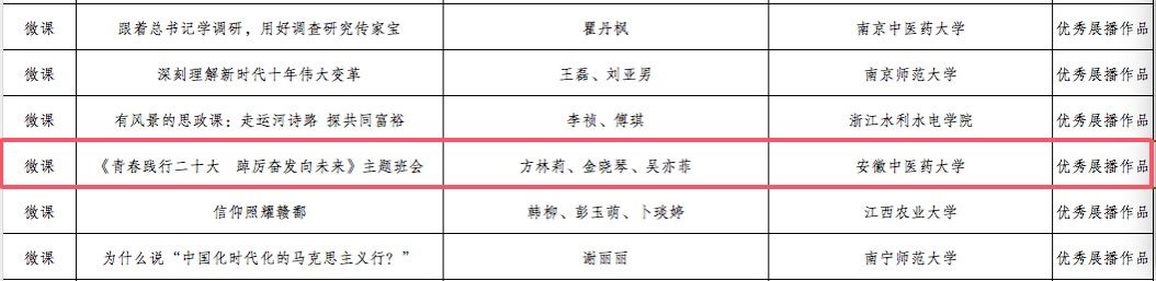 我校选送的主题班会微课《青春践行二十大 踔厉奋发向未来》(作者:方林莉、金晓琴、吴亦菲)聚焦党的二十大精神,围绕“爱国、团结、奋斗、科学、互助”关键词,结合国家大力支持和促进中医药振兴发展以及安徽省支持学校建设一流中医药大学的良好机遇,激发广大学生抢抓机遇、拼搏奋斗的斗志,引导学生思考“个人梦”与“中国梦”的关系,立志用青春之声回应“时代之问”,用青春之力召唤青春之势,用青春之我创造青春之中国。