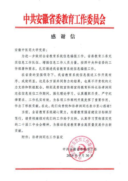 近日,我校收到省委教育工委发来的感谢信,对我校宣传部孙孝涧同志在教育厅办公室借调期间的辛勤付出予以表扬,并对学校给予的大力支持表示衷心感谢。