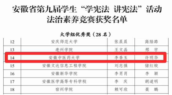 10月14日,安徽省教育厅正式公布了全省第九届学生“学宪法讲宪法”比赛的获奖名单,我校三位参赛选手凭借卓越表现斩获佳绩。
