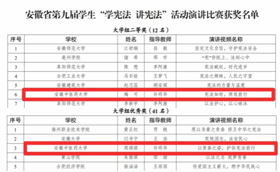 在许明华老师指导下,梅可同学的«宪法如炬,照我前行»和周琪琪同学的«以青春之姿,护佑宪法前行»分别获得演讲比赛大学组二等奖和优秀奖,李香玉同学获法治素养竞赛大学组优秀奖。